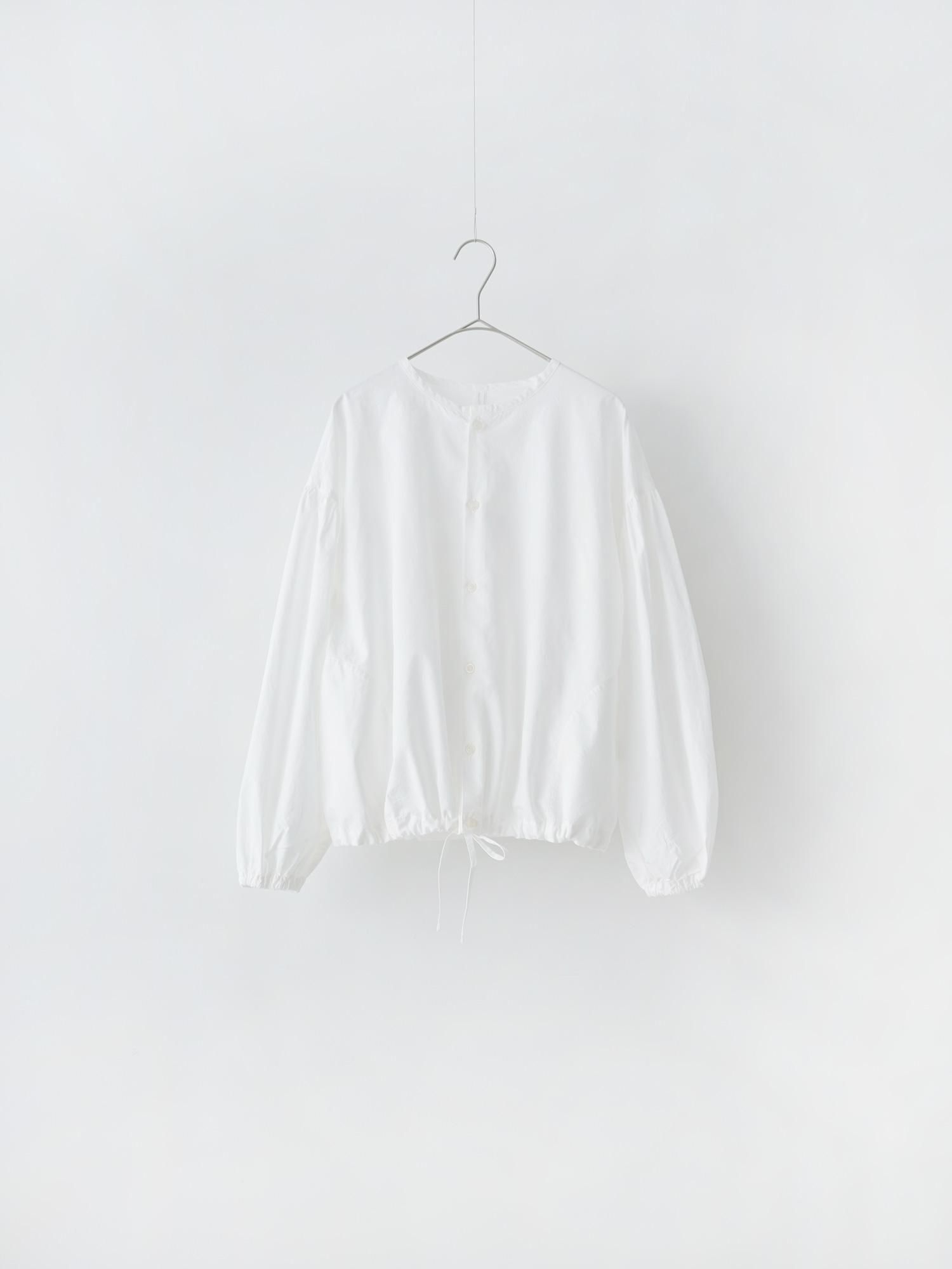 上質でハリのある素材感ながら、軽くてさらっとした肌触りが特徴のブロード素材。滑らかで光沢感のある生地に製品染めを施すことで、表面に独特な風合いが加わります。クルーカーディガン風にデザインしたシャツは、ほんのり開いた襟元に小さなボタンが並び上品な女性らしい印象。大きすぎない絶妙なゆとりを持たせた身幅に対して、袖付けの部分にはギャザーと袖口にもゴムを利かせることで、ふんわりとした立体感のでる着こなしを表現します。また、裾には紐が入っているので寄せることでシルエットの変化や調整が可能。名前の通りボタンを開けて羽織としても良し、前の釦を全て閉じたプルオーバーシャツとしての着こなしも素敵に決まります。