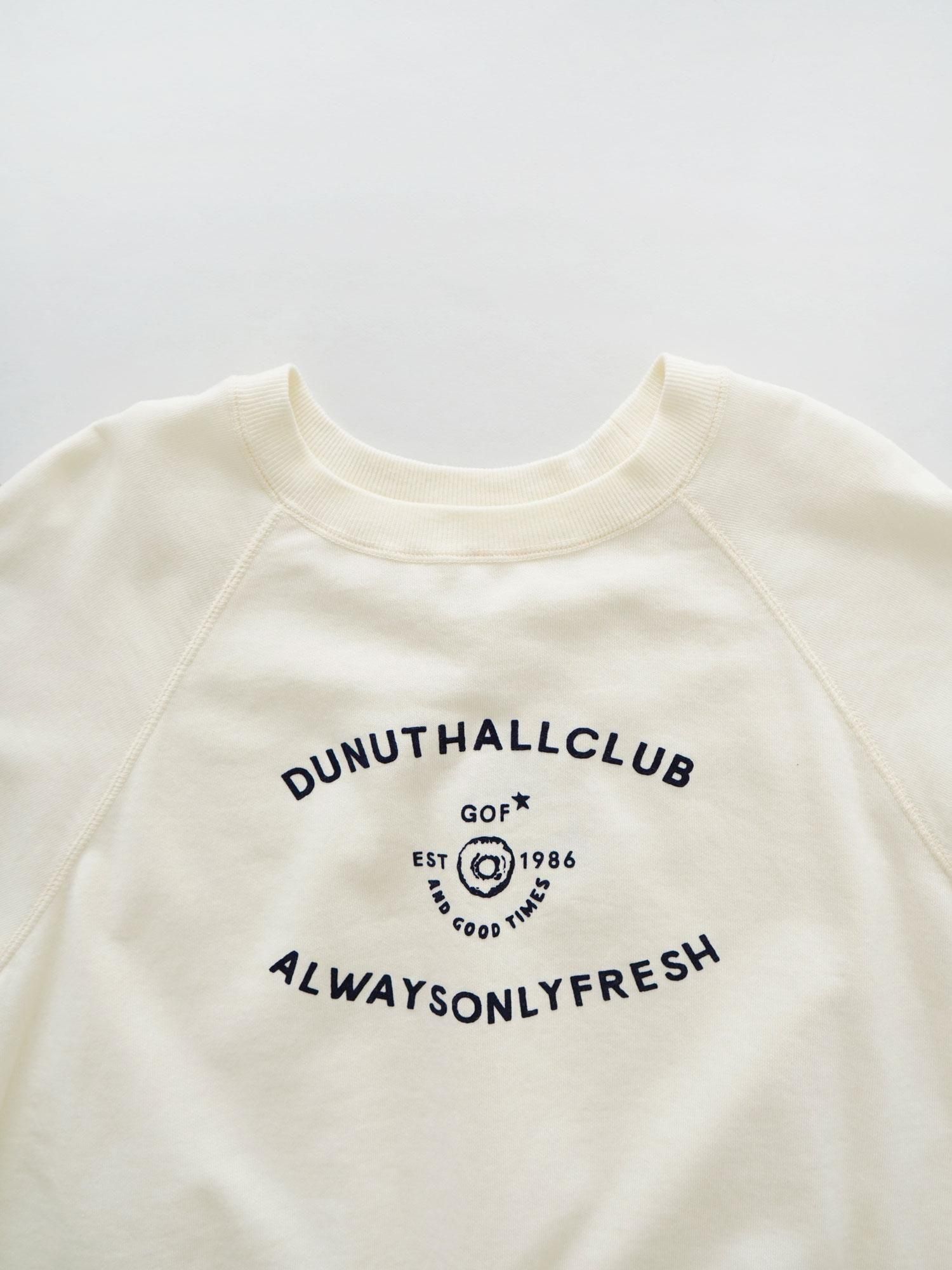 Tシャツより厚地ですが、スウェットに比べると薄手になっている絶妙な生地感が使いやすいミニ裏毛。合わせやすく飽きのこないベーシックなシルエットのプルオーバーを作りました。大きすぎない適度なゆとりの身幅に着丈はやや長め。襟ぐりから脇にかけて斜めに切り替えたラグランスリーブで動きやすくなっており、襟や袖口に裾といった部分をリブ仕様にすることで全体にメリハリを利かせています。身頃にはフェルトのような質感が特徴のフロッキープリントで表現したロゴをプリント、いつも揚げたてのドーナツを売っている架空のドーナツ屋さんをイメージしました。全面に主張しすぎないさりげなさが魅力の取り入れやすいデザインに仕上がっています。