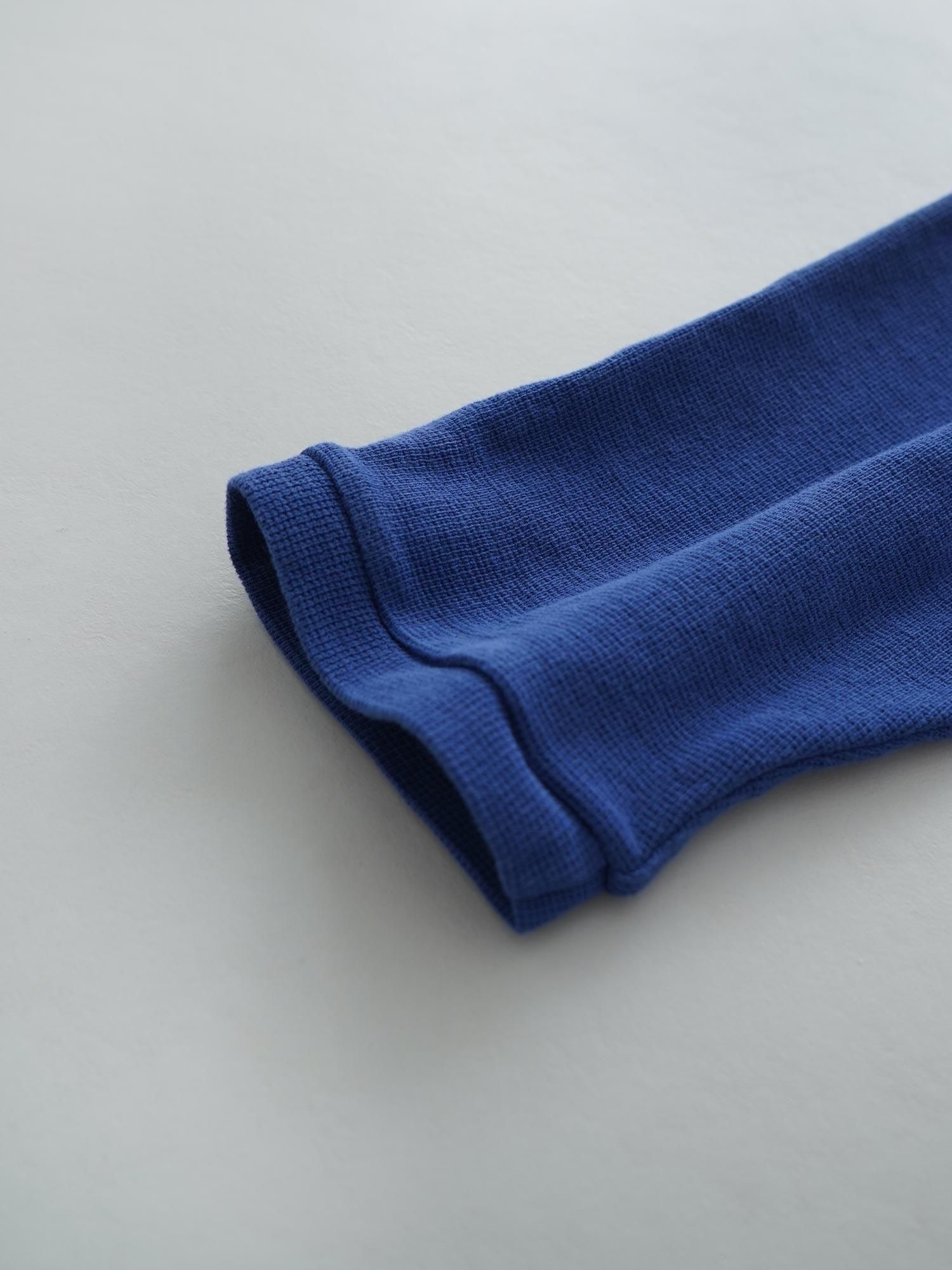 適度に厚みがあり張りつかず、身体のラインを拾わない素材感のミニ畦ワッフル。特徴的な編み地のワッフルをベースに、前身頃には部分的に布帛を使用し異素材の組み合わせと切り替えが目を引くカーディガンを作りました。肩から身幅にゆとりを持たせたワイドなシルエットですが、前側の切り替え線が内に入ることですっきりとシャープに見せる視覚効果が嬉しいポイントに。素材によって違いがでる色の染まり方でメリハリが付き、細やかなワッフル地がカジュアル過ぎずない仕上がりになっています。カーディガンとしてはもちろん、ボタンを留めるとプルオーバーのような着こなしも楽しむことが出来ます。