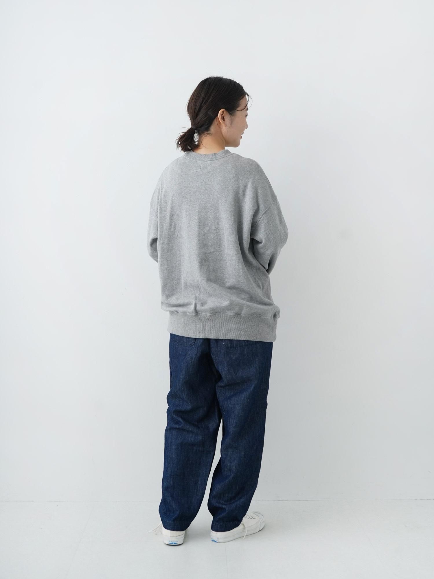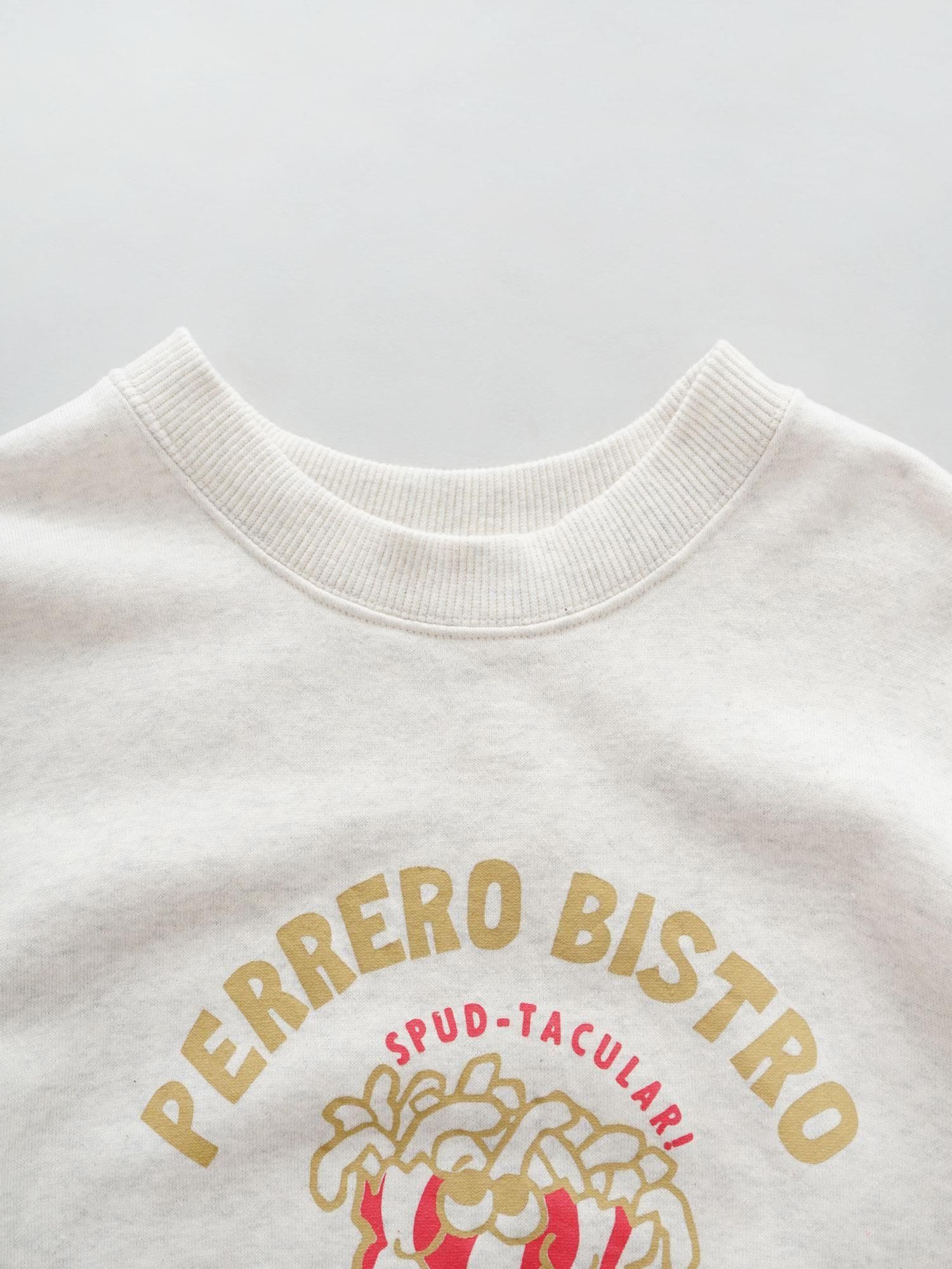 コーマ糸を使用した程よい艶感がある裏毛プルオーバーは、重すぎない厚みの生地になっています。大きすぎず小さすぎない絶妙なサイズ設定と肩から袖回りにかけて動きやすい作りにしており、襟ぐりと袖口、裾といった部分にリブを利かせすっきりとさせました。身頃の真ん中には、フライドポテトのイラストとスペイン語で”最高においしい” ”ストリートでありながらエレガント”と書いたロゴをプリントし、架空のビストロの看板をモチーフにしています。ベースの色とラバープリントのカラーリングが楽しい一着、パンツにもスカートにも馴染み日々の着こなしに取り入れやすいアイテムに仕上げています。ゆったりとしたリラックスカジュアルな雰囲気が好きな方は、3sizeもオススメです。