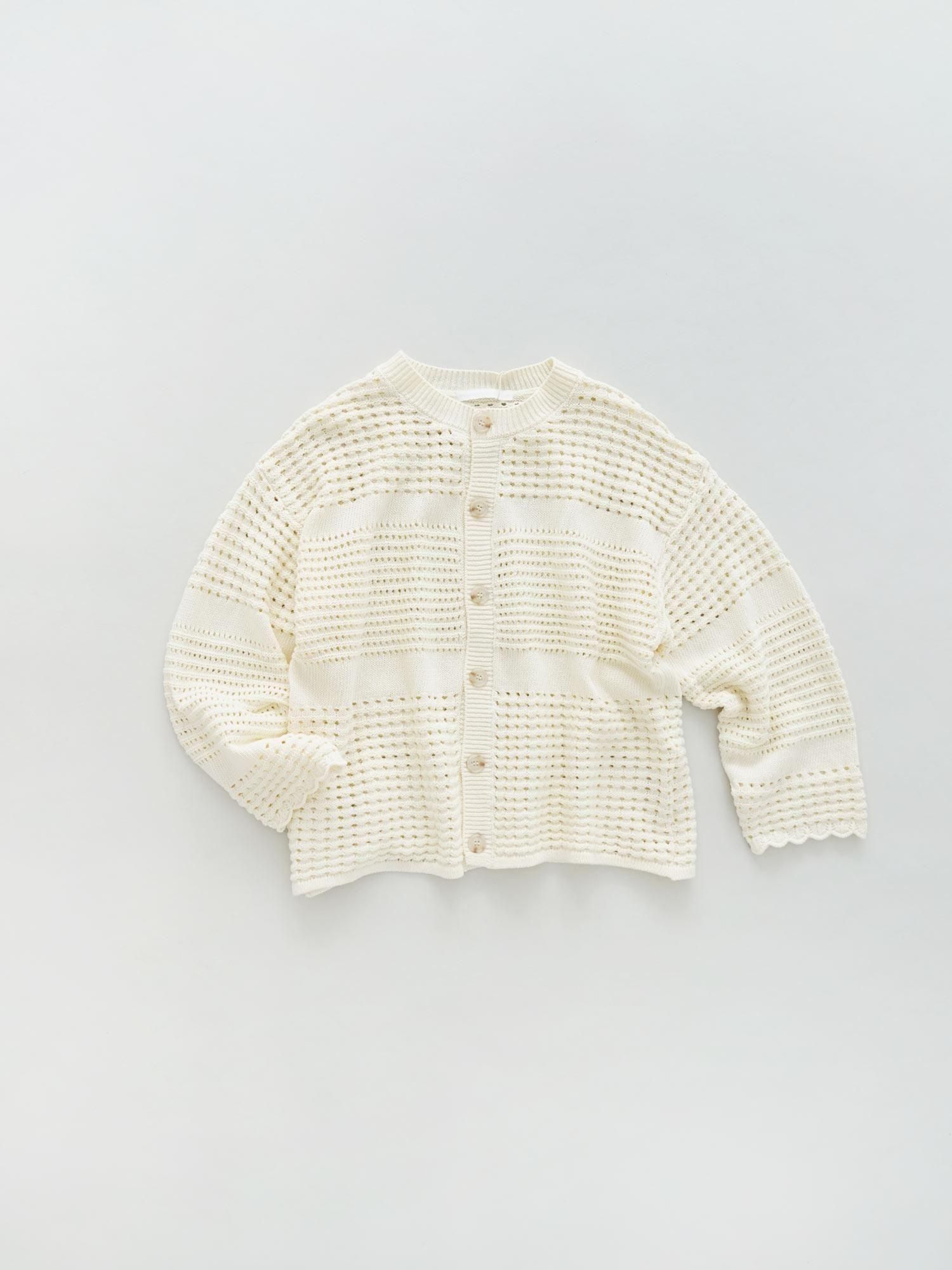 柔らかく優しい肌触りで、透かし編みが軽やかなカーディガン。ゆったりとしたトップスの上からでも羽織ることの出来る、ゆとりを持たせたサイジングになっています。丸っぽいモチーフが甘すぎない雰囲気で、編み地に変化をつけることにより絶妙なコントラストが利いた立体感のあるデザインを楽しむことが出来ます。袖口のスカラップ仕様がさりげないポイントに。落ち着きのあるベーシックな色展開がコーディネートをまとめ、きれいに整えてくれる一着です。