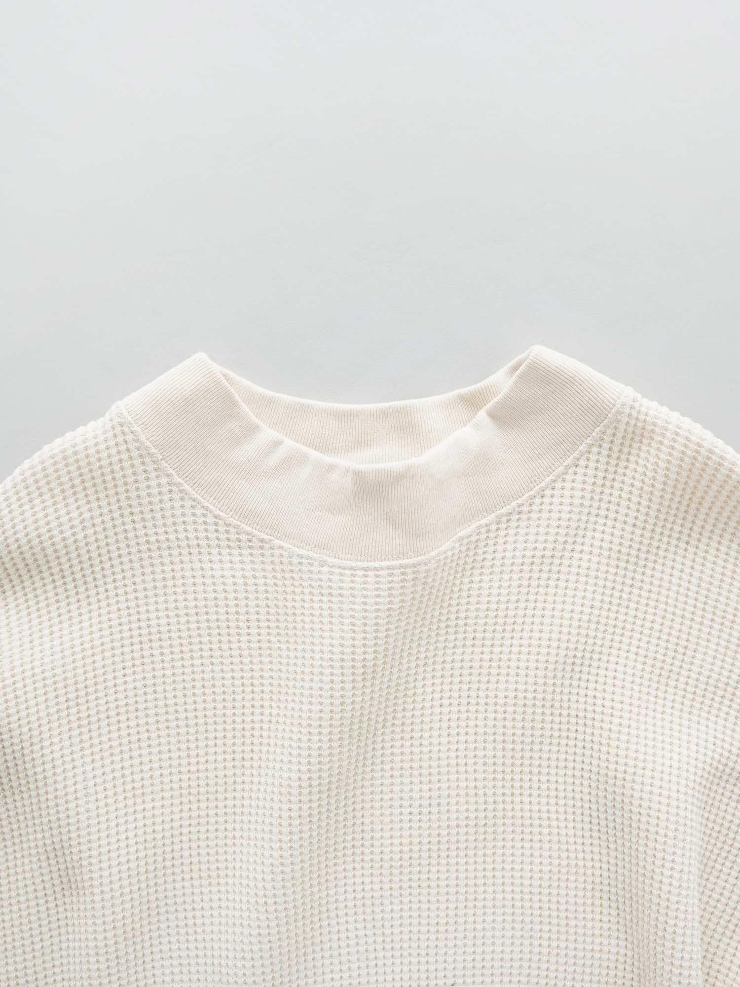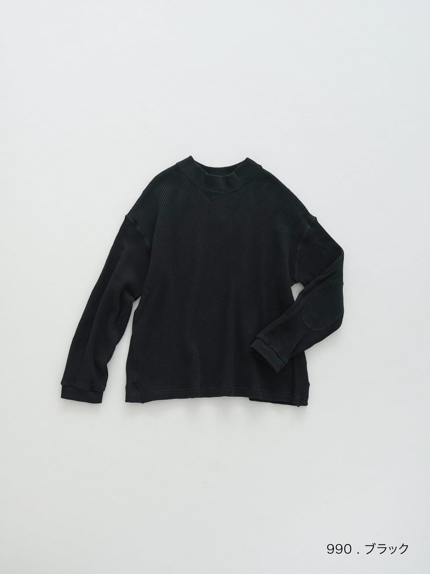 シャリ感のあるサラッとした着心地が特徴のワッフル、空紡糸を使用しました。空気の力で紡績しているのでボリューム感がありながらもドライタッチで程よく硬めの風合いです。少し立ち上がったようなモックネックで顔周りをすっきりと見せつつも、身幅はゆったりとした設定にし、デイリーに取り入れやすいカットソーを作りました。肘にはポイントとして同色ベースのエルボーパッチ、裾にはさりげない三角状のマチ付き。シンプルながら細部にまでこだわりを感じることの出来る一着になっています。単体ではもちろん、インナーにも最適な着やすさ、ニットやジャケット合わせにとても役立ちます。