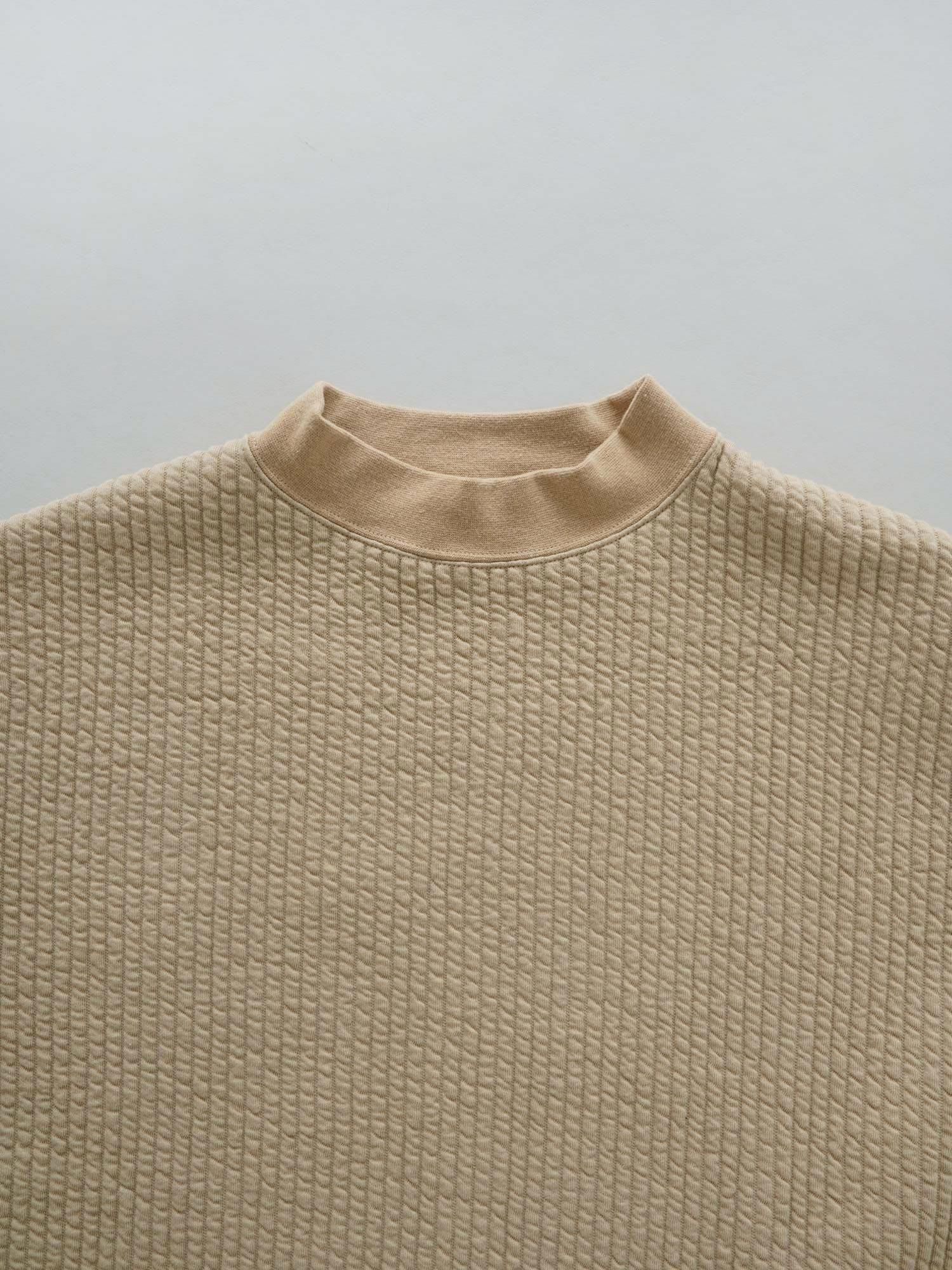 カジュアル感を抑えたタテ縞模様が特徴のストライプキルト、ふっくらとした優しい肌触りの生地感です。首周りをすっきりと綺麗に見せてくれる、少し高さのあるモックネック。シンプルな形とベーシックなカラーリングで、スウェットのような感覚でラフに着ることの出来るアイテムですが、落ち着いた上品な雰囲気を併せ持っています。ウールのニットがあまり得意でない方に一度試して頂きたい、オススメアイテムになっています。