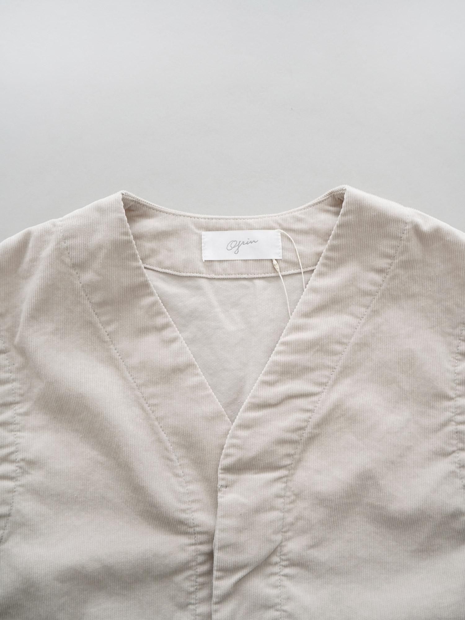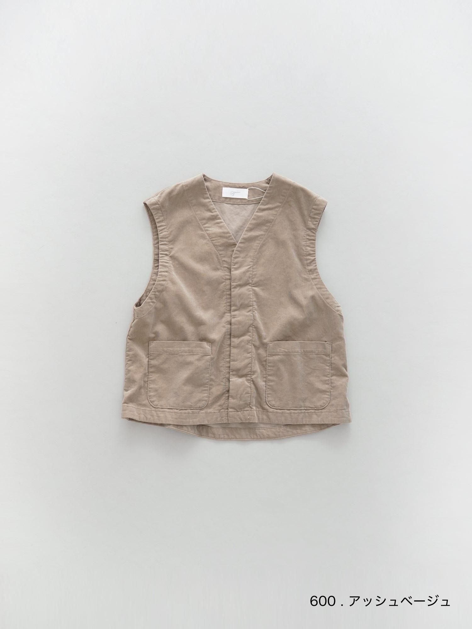 カジュアルなイメージの強いコーデュロイ、畝の太さを細くすることで落ち着いた柔らかな雰囲気を作り出しています。深すぎないVネックに緩やかに落ちた肩のラインが女性らしく、内側のボタンが見えない比よく仕立てがきれい目な印象を与えるベスト。前を開けると抜け感がプラスされ、シャツや薄手のニット、ワンピーススタイルに1枚加えると着こなしにこなれ要素が加わります。合わせるアイテム次第でコーディネートの幅が広がり、持っておくと何かと便利なアイテム、同シリーズのパンツと合わせたセットアップ風の組み合わせも素敵に決まります。
