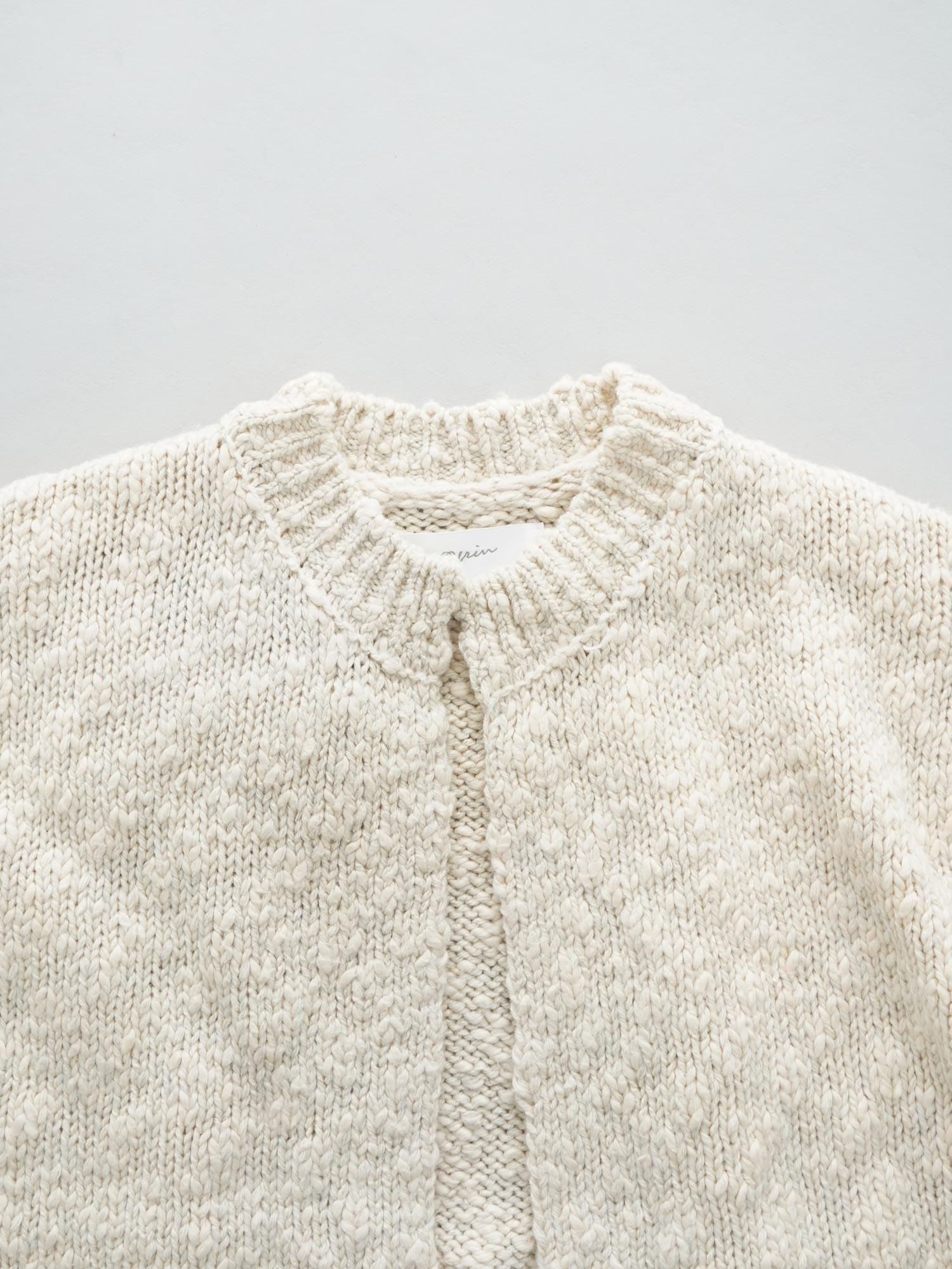 ざっくりとした編み地と凹凸感のあるネップが特徴的なコットンウールネップ。ポコポコとした独特な手触りと温かみのある風合いが秋冬らしい素材です。適度にゆとりを持たせた絶妙なサイズ感のニットカーディガン、ボタンを付けないシンプルな作りでふわっと羽織ることができ、前側をピンでとめる仕様に。襟や袖口、裾の編み方に変化をつけ、素材の魅力も相まっていつもと一味違ったデザインになっています。ナチュラルな雰囲気がありつつも粗野すぎないので、ワードローブに取り入れやすい一押しニットです。