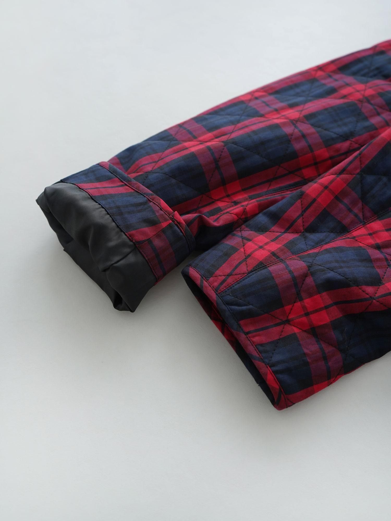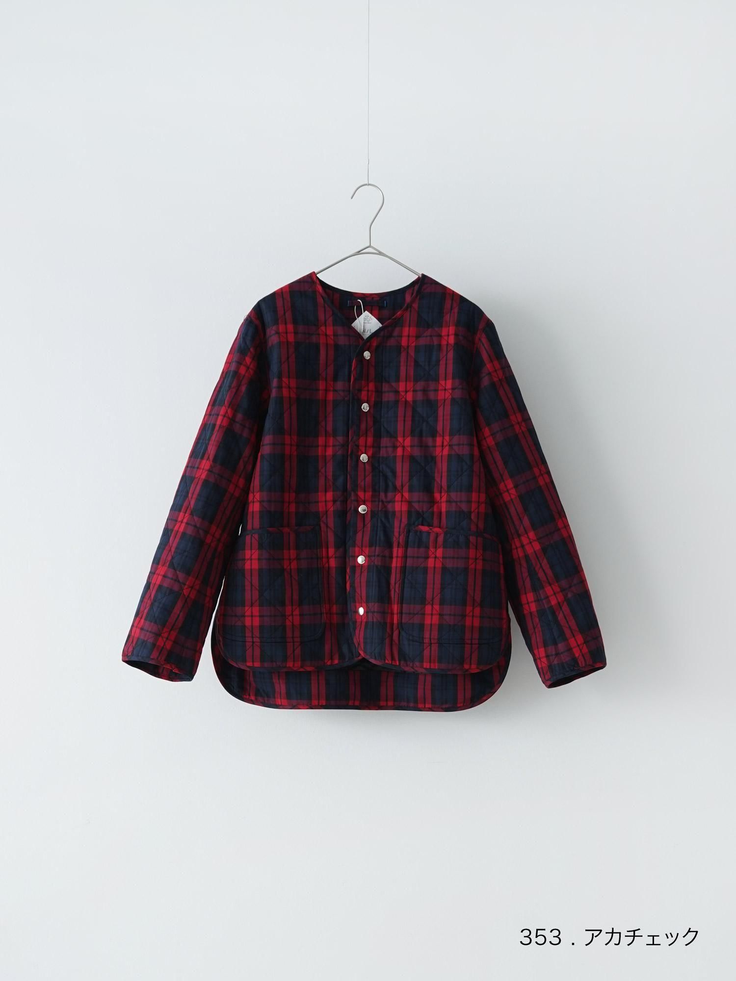 極薄の中綿を挟み込んだ軽くて暖かいキルティングを使用しました。キルティングの特徴は何枚かの生地を重ねて作られているところ、何本ものステッチ使いが生地をしっかりと固定することにより丈夫で長持ちする素材になっています。ひし形模様のステッチワークが可愛く、素材の魅力を活かしたラウンドジャケット。適度なゆとりを持たせたサイジングで気軽に羽織りやすく、少し浅めのVネックの様な襟元が中に合わせるトップスをきれいに見せてくれます。端々のパイピング使いと着脱がしやすくなるヴィンテージライクなスナップボタン、ジャケット=羽織るモノ、そんな羽織りに欠かせない部分の1つであるポケットといったディティール部分もポイントで利かせました。バランスの取りやすい着丈と裾は深めのラウンドにし、秋の深まりにピッタリな一着です。