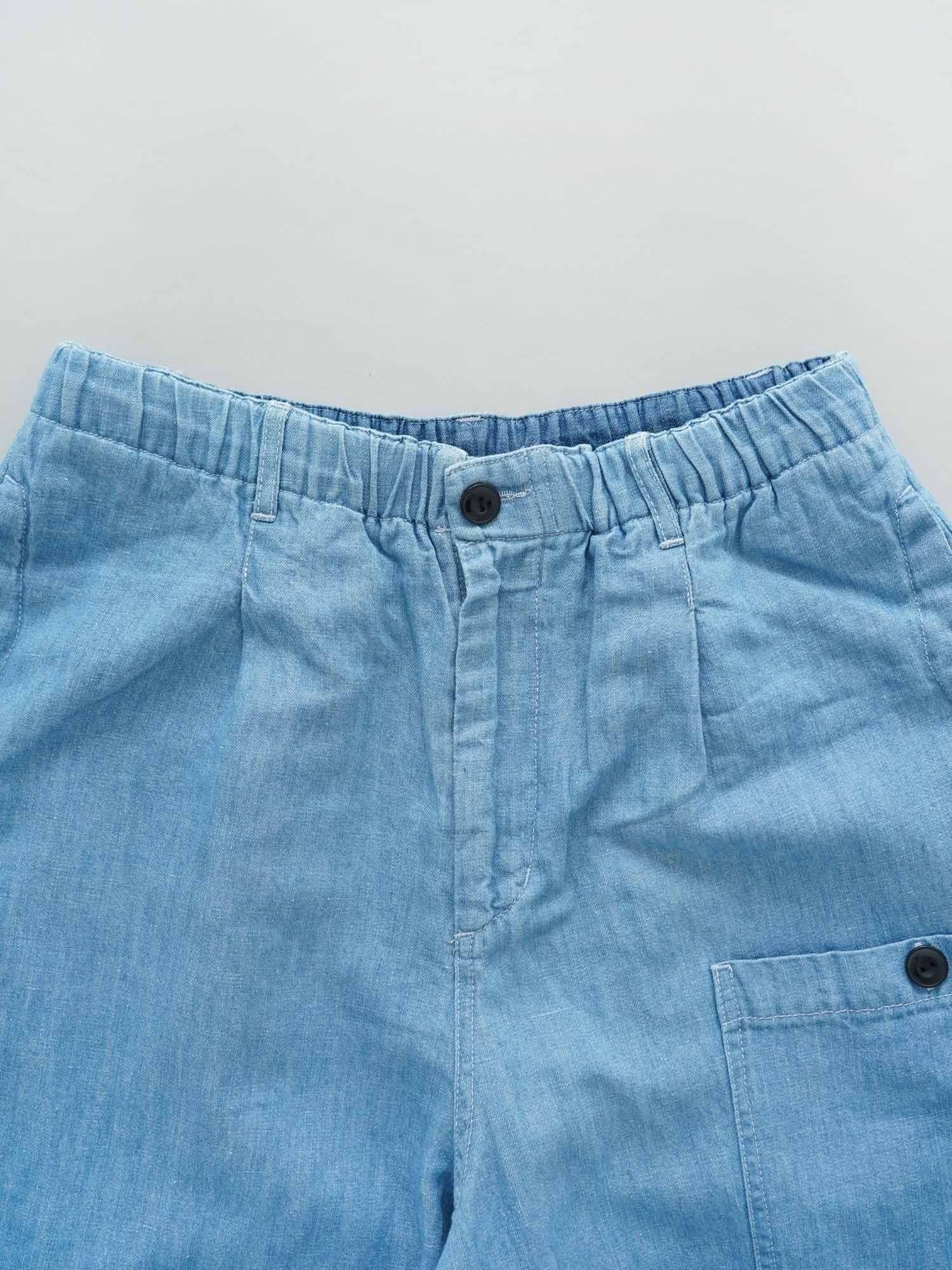麻のさらっとした肌離れの良さと綿の柔らかな着心地を兼ね備えた綿麻デニム。程よい生地の厚みと綿麻ならではの軽さが特徴です。ウエストはゴム紐仕様のゆったりとラクな穿き心地、膝回りまではワイドな作りで裾に向かって緩やかにテーパードした、すっきり見えするシルエットのパンツに仕上げています。ミリタリー要素を含んだやや下に付けたポケットがディティールポイントの一つに。繰り返し穿き込むことで馴染み、生地の風合いや色味といった表情の変化が見えてくるので、経年変化の過程も楽しんで頂ける一着になっています。