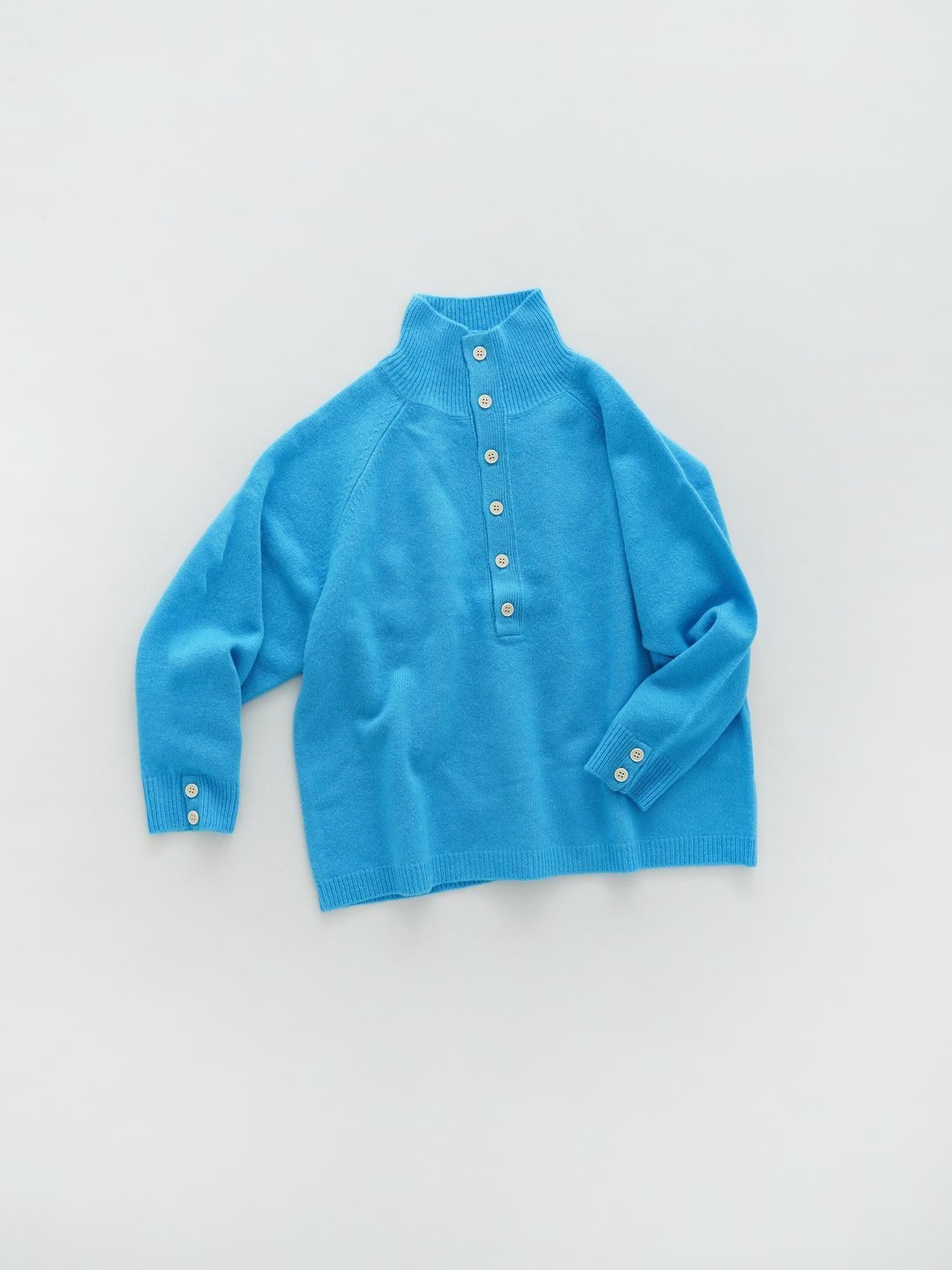 16番の糸を2本より撚り合わせたミドルゲージのメリノウール、滑らかな肌触りで着心地の良さが特徴です。ラフさのあるゆるいシルエットで動きやすいラグランスリーブのプルオーバー。首に沿うような形のタートルと首元から胸下辺りまで前立てがあり、ボタンで開くヘンリーネック仕様を掛け合わせました。タートルを開いて襟の様な形にすると雰囲気に変化をつけることが出来ます。ニットのふんわりとした質感に明るいカラーが加わり、暖かいオススメのニットが完成しました。部分的な編み地の違いや袖口に並んだボタンがさりげないアクセントで利いています。