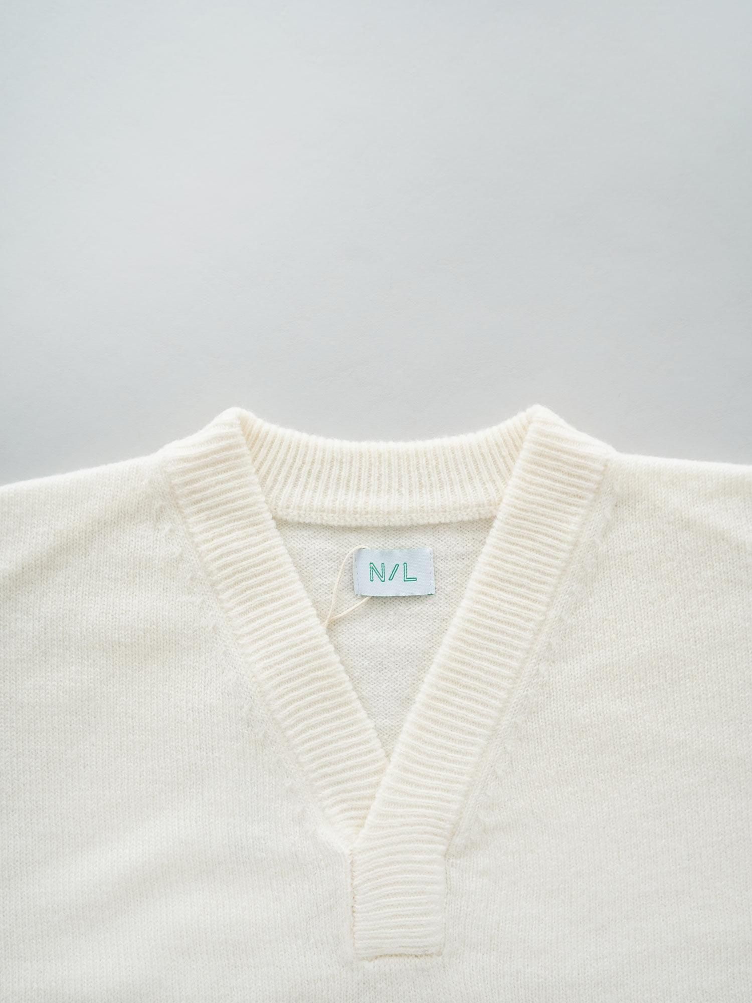 滑らかな肌触りと柔らかさが魅力のメリノウール100%の糸を軽縮してふっくらと仕上げた素材を使用しています。今季のN/Lシーズンテーマ”new old"を意識し、クラシカルな印象のレタードニットやスクールニットのディティールを取り入れ、現代的な形に落とし込んだニットシリーズを作りました。アイビールックを思わせる特徴的なYネックの襟元にしつつも、無地でまとめることによって落ち着きのある大人の雰囲気を醸し出します。シャツやカットソーがレイヤードしやすいゆとりを持たせたサイジングが着やすく、端々に利かせた編み地の変化がさりげないポイントとして光ります。