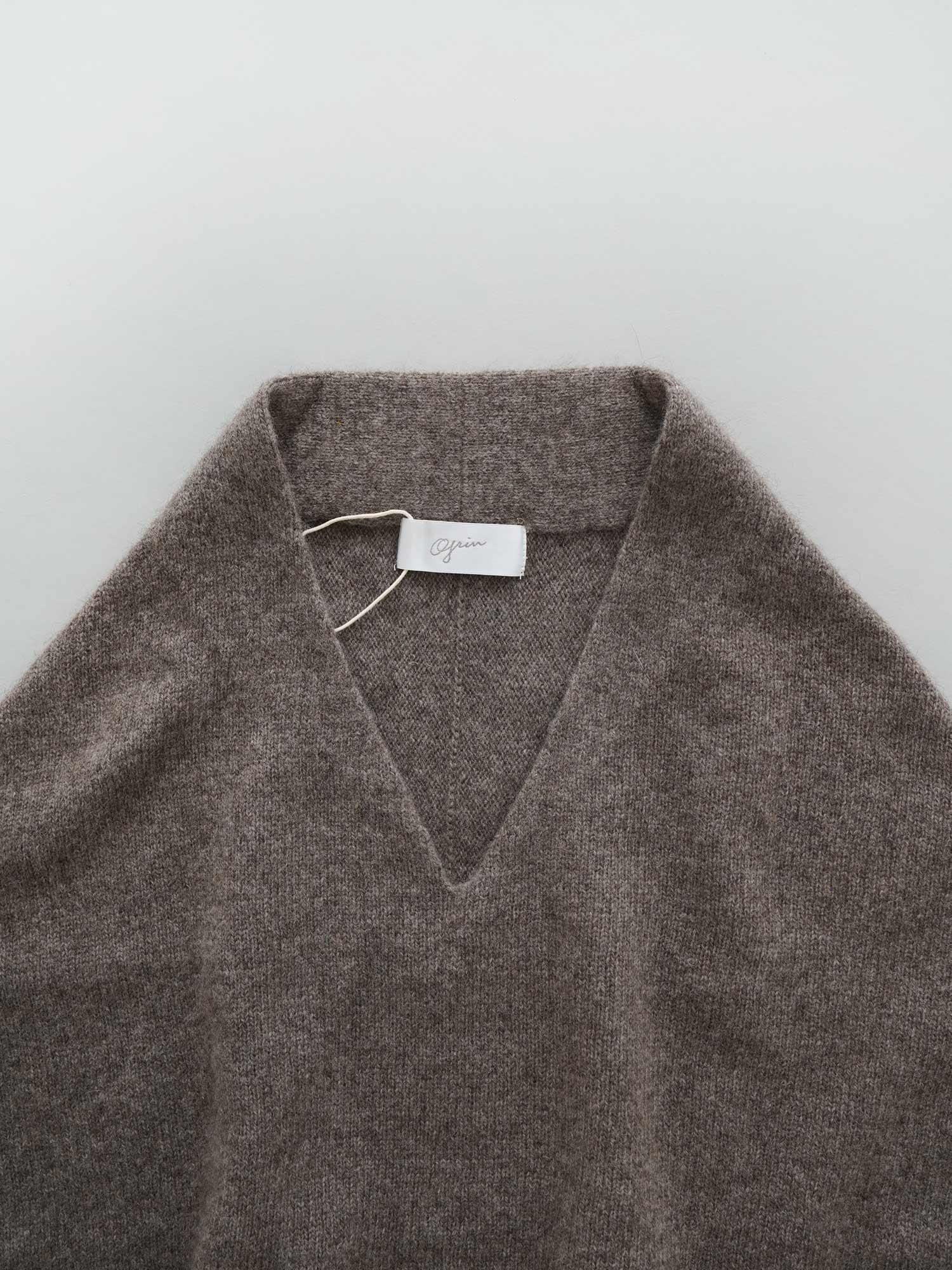 ヤクが10%含まれたふわりと優しい肌触りのYAKウール。細めの糸で編むことにより、とても軽い着心地になっています。前から見るとVネック、後ろ側は少し立ち上がるような変形デザインが特徴のベスト、身幅はゆったりとしているのでとても着やすい作りに。二の腕に掛かるくらいの袖丈と前後の着丈にしっかり差を付けることでメリハリを利かせ、シャツやカットソーはもちろん、ワンピースにレイヤードするとお洒落に決まります。ニット特有のチクチク感が気になりにくく、柔らかさや上品な女性らしさを感じるニットです。