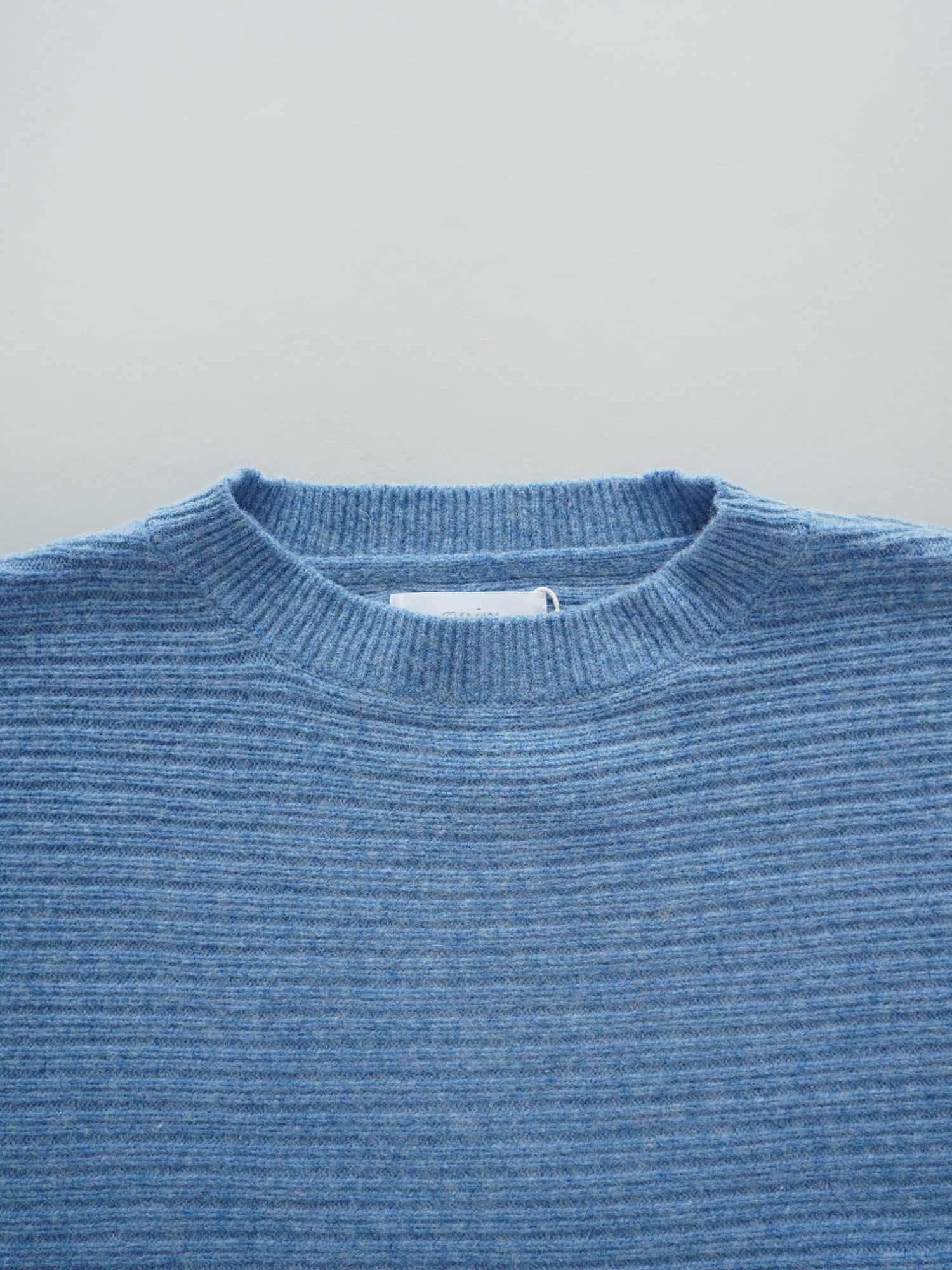 柔らかく優しい肌触りのラムナイロンを使用。度目を詰めずに作っている為、ゆったりとしたワイドなシルエットでも軽やかさのある着心地になっています。広く取った身幅に対して、やや前後差を付けた着丈はコンパクトにまとめ程よいバランス感に。袖口のリブ編み部分を長くすることで捲った際に止まり、袖に出来たポワンと膨らんだような溜まり具合がかわいいニットプルオーバーです。