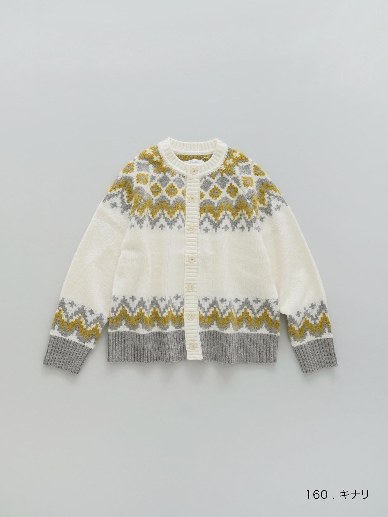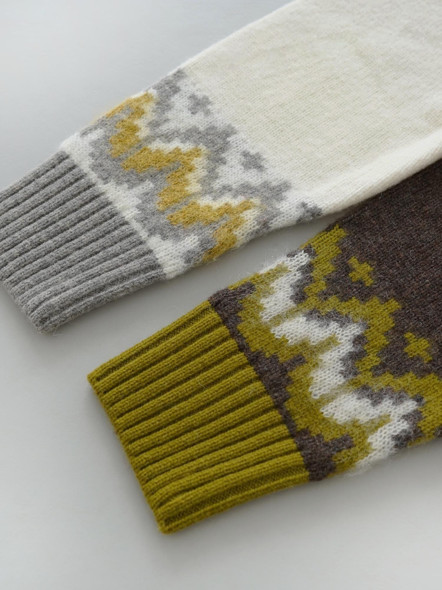 アイスランドのロピーセーターからイメージした、ローゲージよりも編み目が少し細やかなニット。grin2025A/Wのシーズンテーマ“tone”に沿って、色が繋がっていくような配色を意識しています。シンプルなクルーネックとシルエットのベーシックな作りに、襟から前立てと袖口や裾の部分に編み地の変化を付けました。上側と下側にぐるりとノスタルジックで民族的な模様を組み込み、存在感抜群のニットカーディガンに仕上げました。