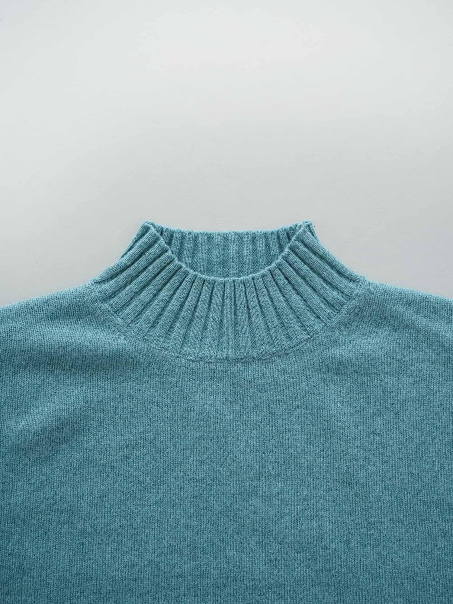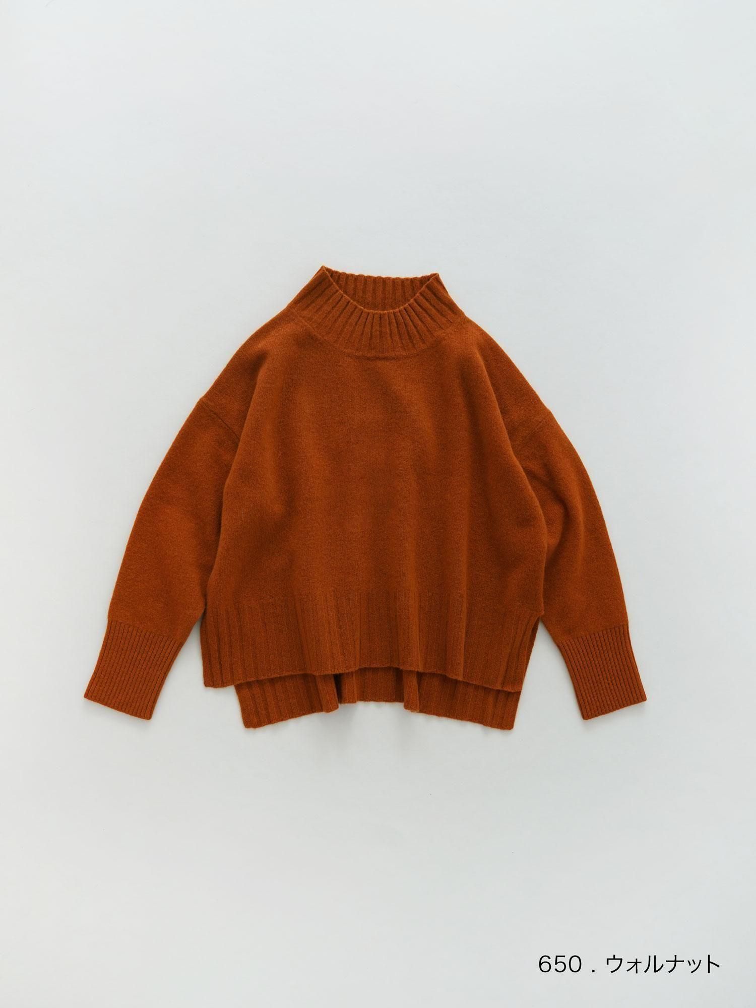 ウールの中でも高級な一品とされている柔らかな素材で、ウール特有のチクチク感が気になりにくいメリノウール。軽やかでふんわりとした肌触りが特徴になっています。身幅はゆったりとした広さを持たせていますが、首に沿うようなハイカラーと袖の作りですっきりとコンパクトに見せる部分によって全体のバランスを整えています。両サイドに入れたスリットと着丈に前後差を付けることによって動きのある軽やかさをプラス。襟と袖口、裾の編み地の変化をポイントで利かせました。ニットの質感と優しい色味が相まって、ほっこりとした暖かみを感じることの出来る1着です。