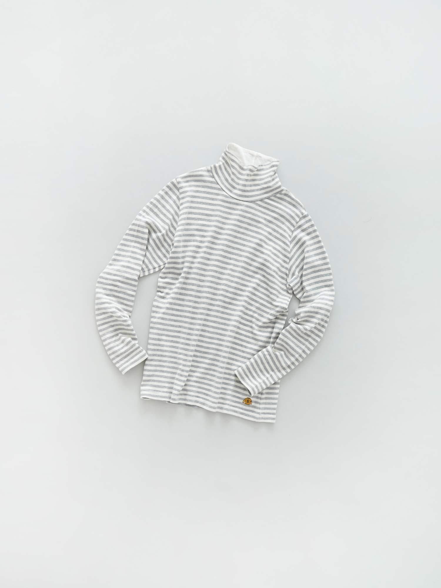 ローゲージ編み機でセーターのように編んだ生地にタンブラー加工を施し、空気を含むことでふっくらとした風合いに仕上げたボーダー。インナーに最適なプルオーバーを作りました。重ねてももたつかないコンパクトなサイズで着用した際のフィット感があり、シルエットをきれいに見せてくれます。すっきり見えする首元にしつつも、ほんのりクシュっとさせた着こなしも可能なので気軽なラフさもプラス。襟の内側を無地の配色にしているところや左裾下のニットセーターのワンポイント刺繍を入れるなど、さりげないポイントも忘れません。2色3色と色違いで持っておきたくなる便利なインナーカットソーです。