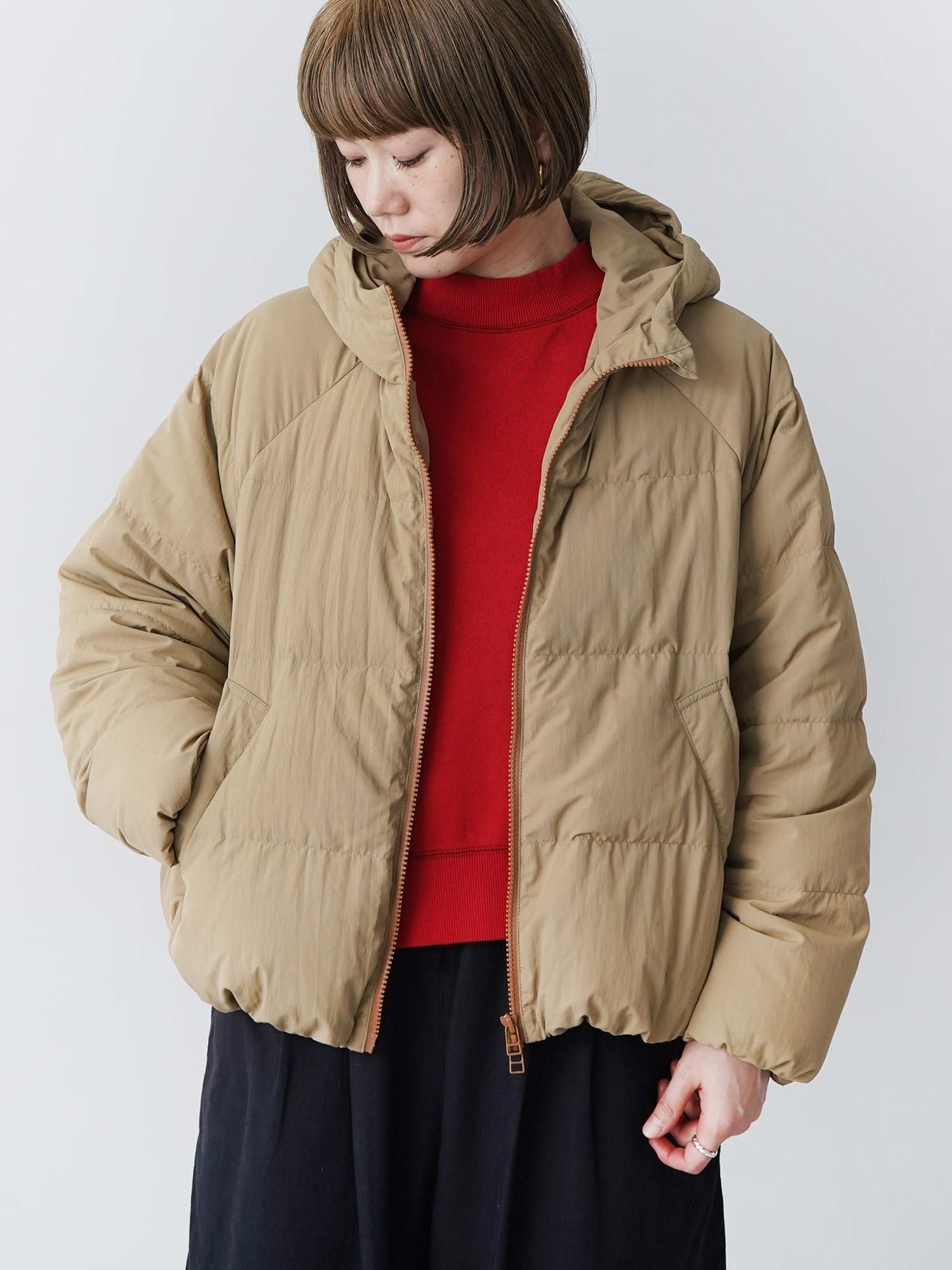 波打ったような表情のあるナイロン、N/Lから新しいアウターシリーズが登場しました。ナイロン特有の光沢感よりもマットな印象が強い落ち着きのあるダウンフードジャケット、ラグランスリーブで動きやすくなっており、コンパクトな着丈の長さです。ファスナーを上まで閉めることで際立つフードの立体感、裾に向かって広がるシルエットが中に着込みやすくなるゆとりを作り、裾のドローコードで形を変化させ丸みをつけても可愛いです。パンツにもスカートにも馴染むバランス力の高さ、コーディネートの幅を広げる一押しのアウターが完成しました。