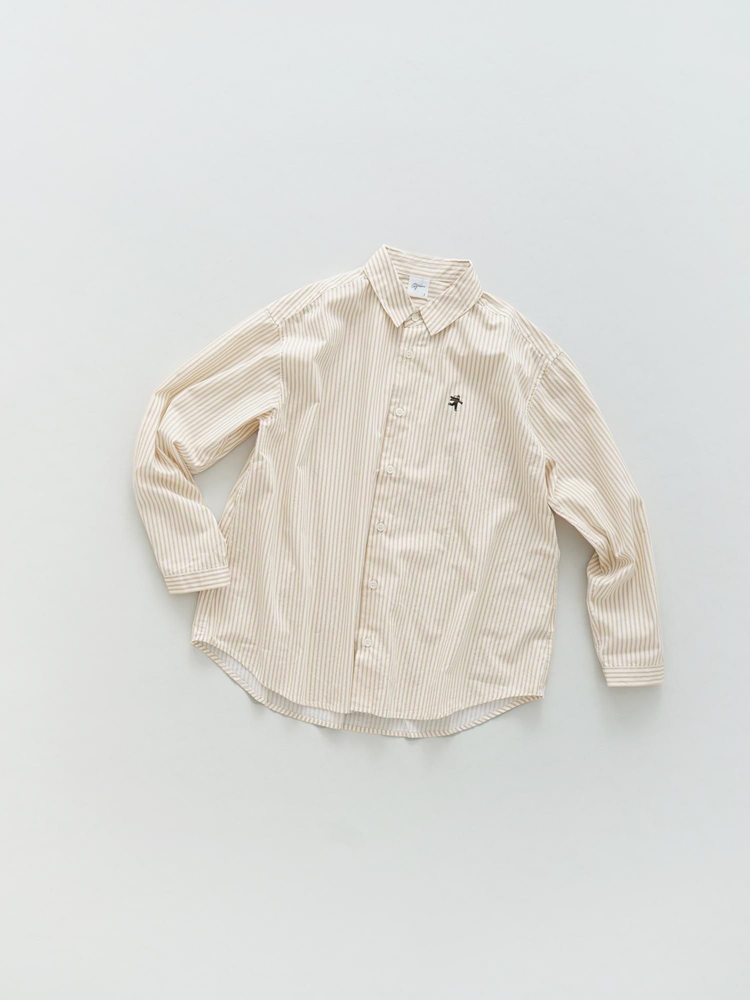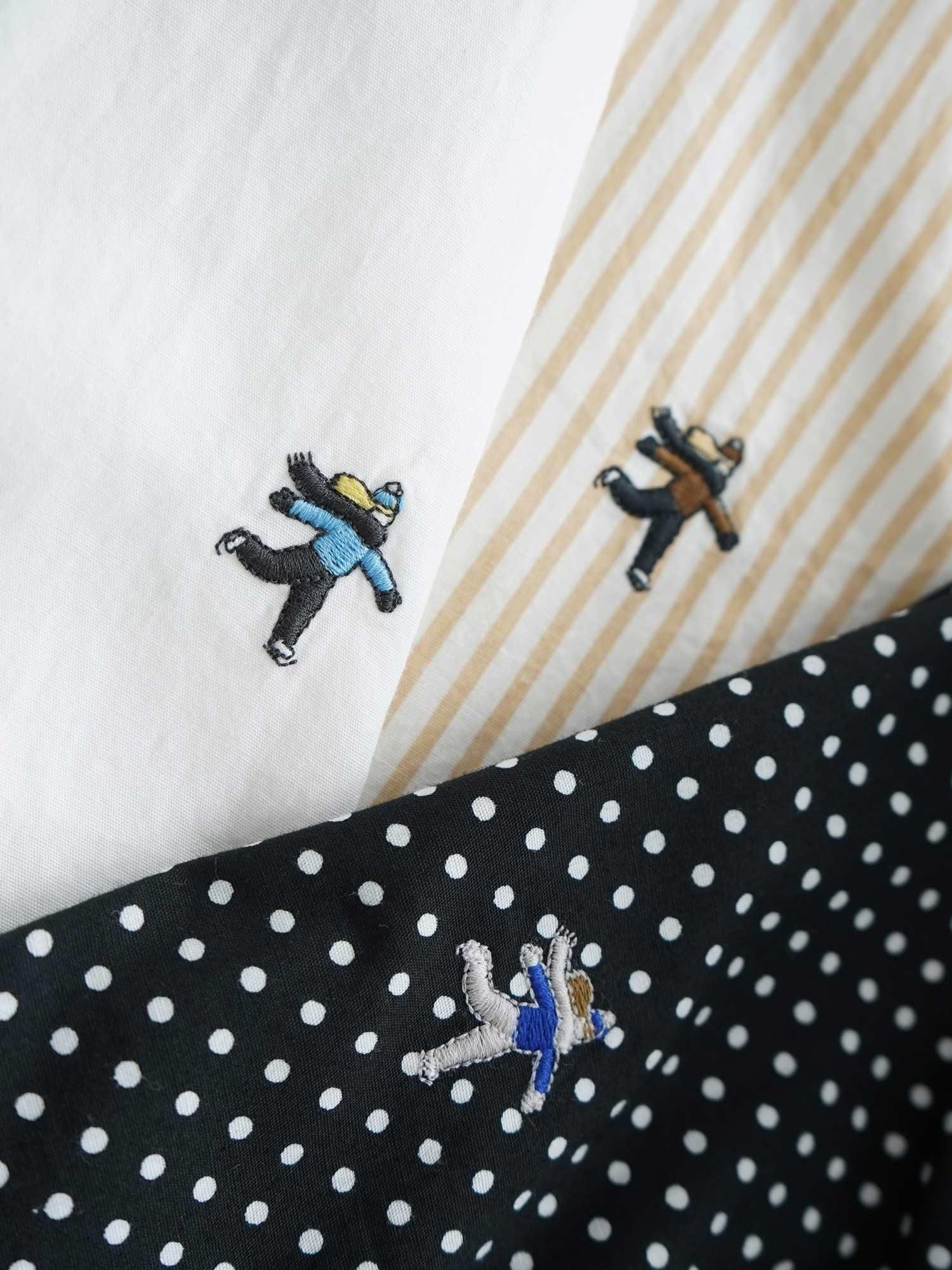 糸ムラが少なく強度と光沢感のある糸を使用したブロード。生地自体の滑らかな肌触りとツヤ感でカジュアルになりすぎず、カチッとした雰囲気を作り出しています。一見するとスタンダードな襟付きシャツですが、スウェットやニットのインナーシャツにした際に裾が見える着丈の長さと、裾をラウンドさせることで重ね着をした時のデザインがきれいな仕上がりになるようこだわりました。左胸の小さなワンポイント刺繍はスケートしている女の子を表現。着こなしの幅が広いので、一着持っておくと何かと便利なシャツです。