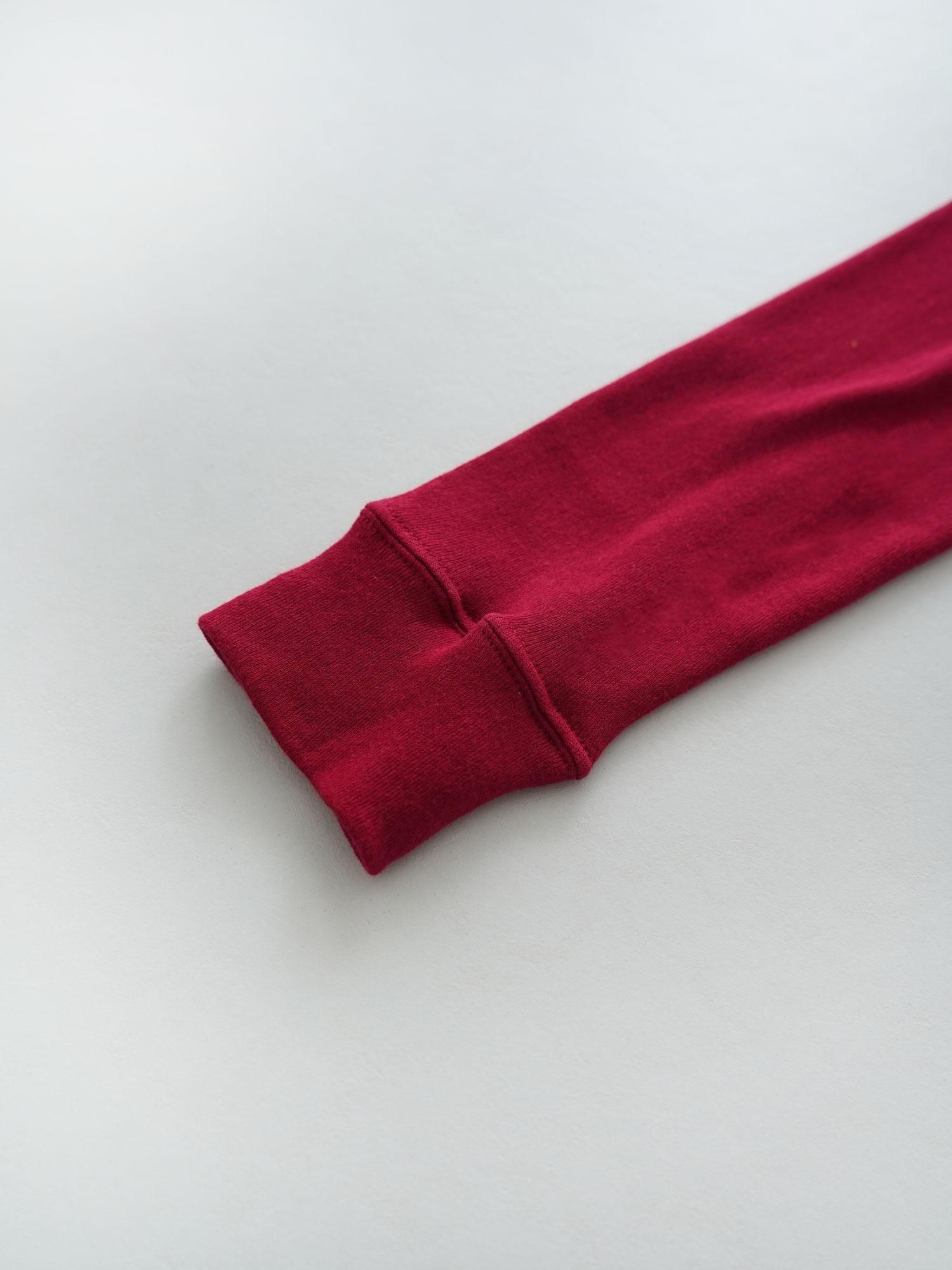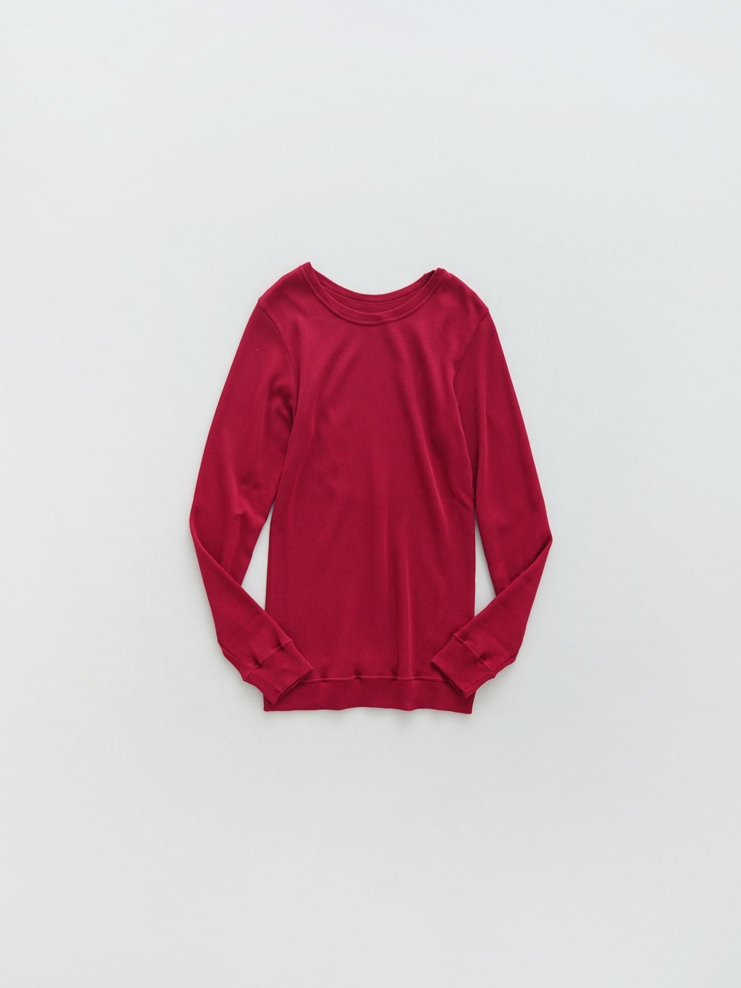 ふわふわと柔らかく3重構造にして編み立てたエアコットン。細い糸に対してハイゲージの編み機を使用するところをローゲージの編み機にすることで、生地にボリューム感を出しています。その特徴的な編み方によって空気の層が生まれ、軽やかで薄手ながらも保温性に優れているところが魅力に。包み込むようなソフトな着心地の良さと伸縮性を活かしたフィット感のあるクルーネックのカットソー、後ろの襟ぐりを広めに取ることによって、上から重ねるトップスから見えないように工夫が施されています。重ね着に最適なすっきりと暖かく着ることが出来る優秀インナーに仕上げました。