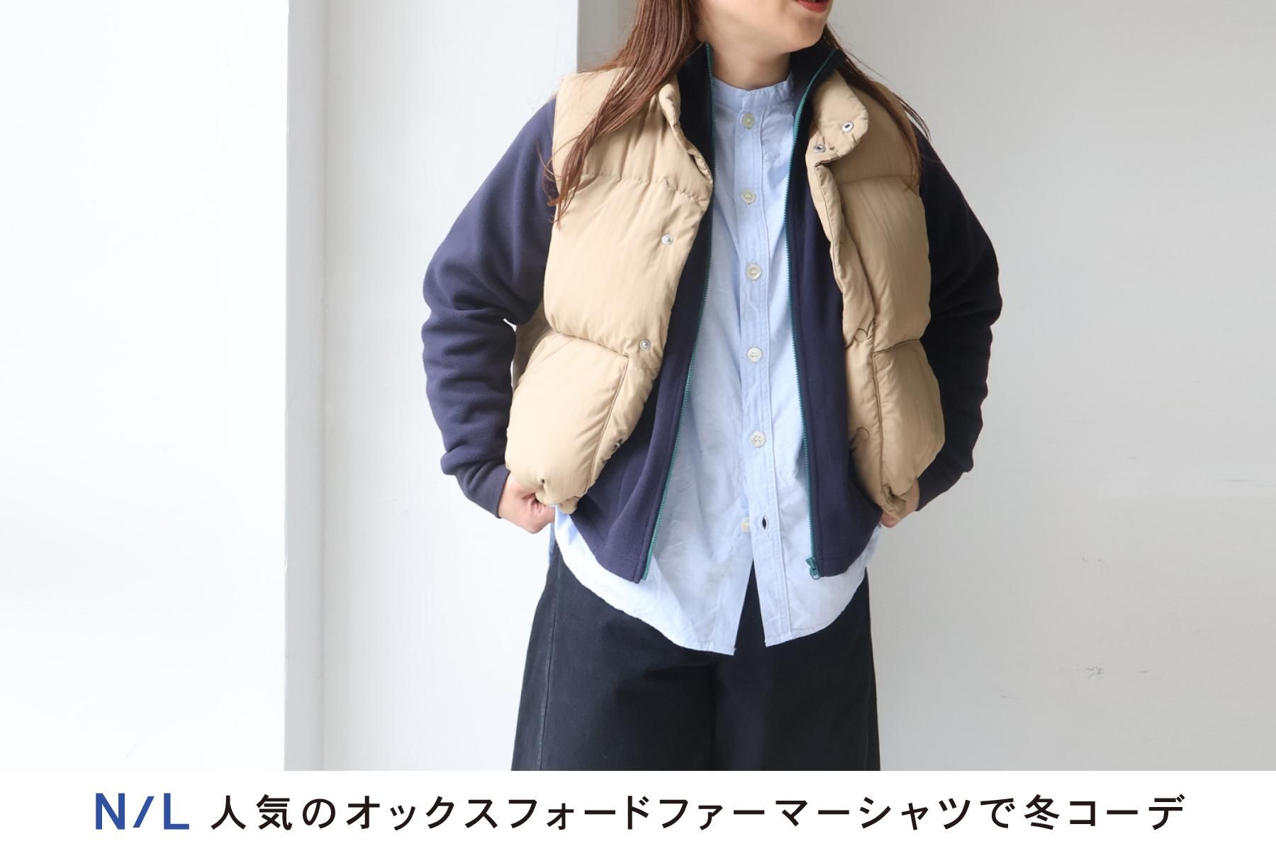 2017年に初めて登場したオックスフォードシャツ。人気の形で様々な声を反映させながら、少しずつアップデートを続けています。今回は前開き仕様の形を復刻し、新鮮なカラー展開でMALK×キナリノの限定シャツを作りました。しっかりとした張りで硬いイメージのあるオックスフォードですが、N/Lで使用しているオックスはソフトな素材感が特徴で着やすさの魅力になっています。身幅にゆとりを持たせることでインナーが重ねやすく、サッと羽織るにも丁度良いサイズ感のファーマーシャツ。スタンドカラーと両サイドの大きなポケットがポイントです。ポケットは前身頃から後ろ身頃の切り替えをわたった位置に付いているところがシャツでは珍しく、昔のアメリカのワークジャケットからディティールを用いました。仕事での着用もオススメで、幅広いシーンに対応可能な利便性の高さ、新鮮なカラーリングが映えるワードローブに加えておきたくなる一着に仕上げています。