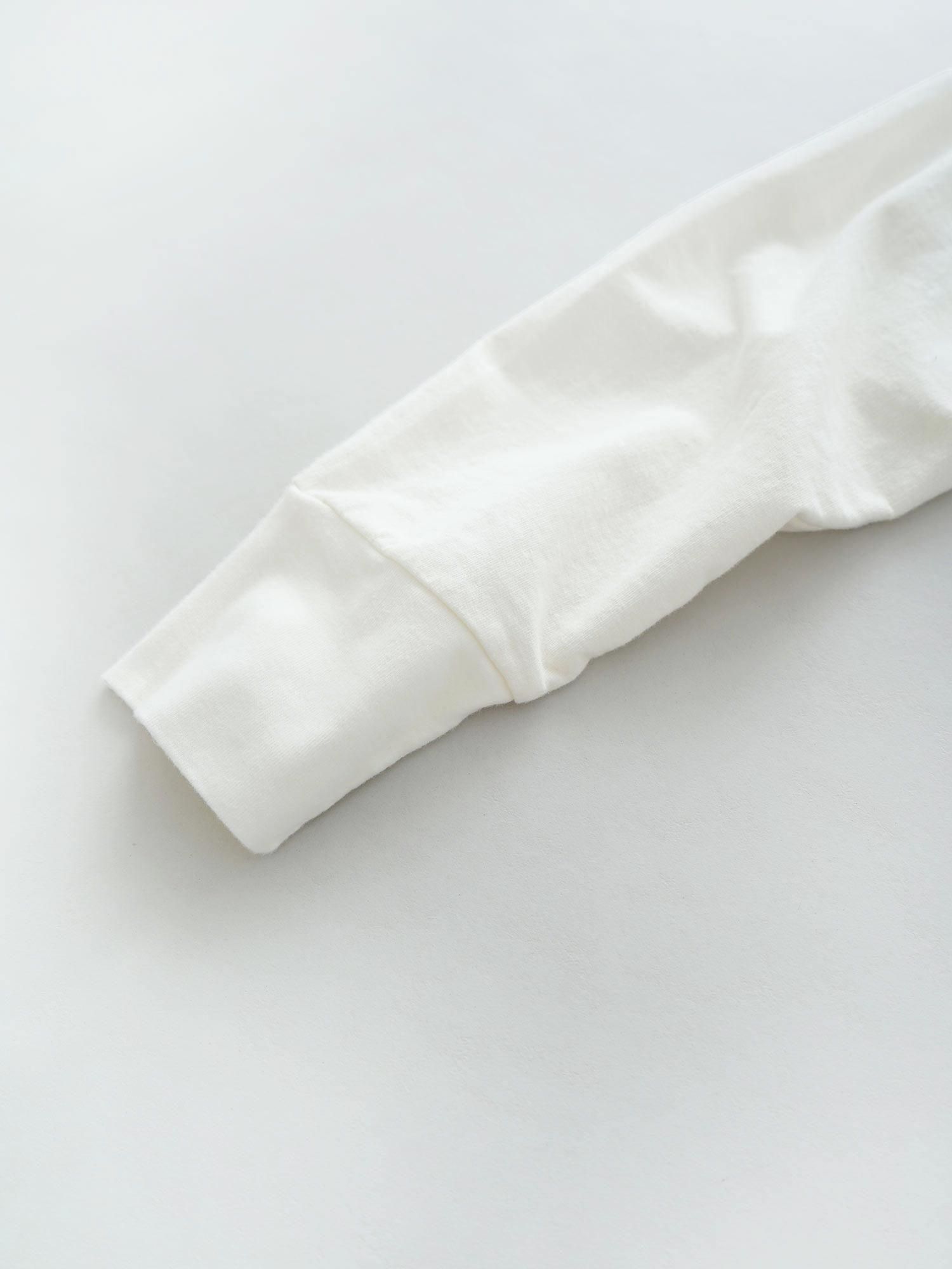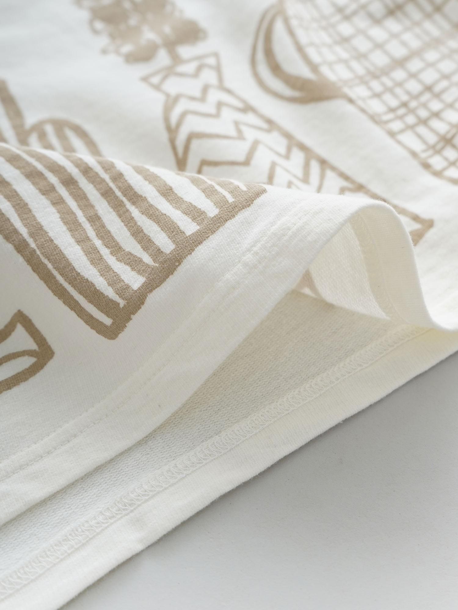 カットソーらしい着心地を残しながら、生地にハリとコシを持たせたホームスパンインレイ。優しい風合いと肌触りが特徴の素材でTシャツ以上スウェット未満の絶妙な厚みになっています。シルエットは身幅にゆとりを持たせたボックス型、モックネックとリブを利かせた袖口といった、部分的にすっきりと見せるところを作ることでメリハリのあるプルオーバーにしました。色々な花瓶を線画で表現したオリジナルプリントは、大きめの柄でも単色で描くことによって、華やかさを取り入れながら自然に馴染む一着に仕上げています。