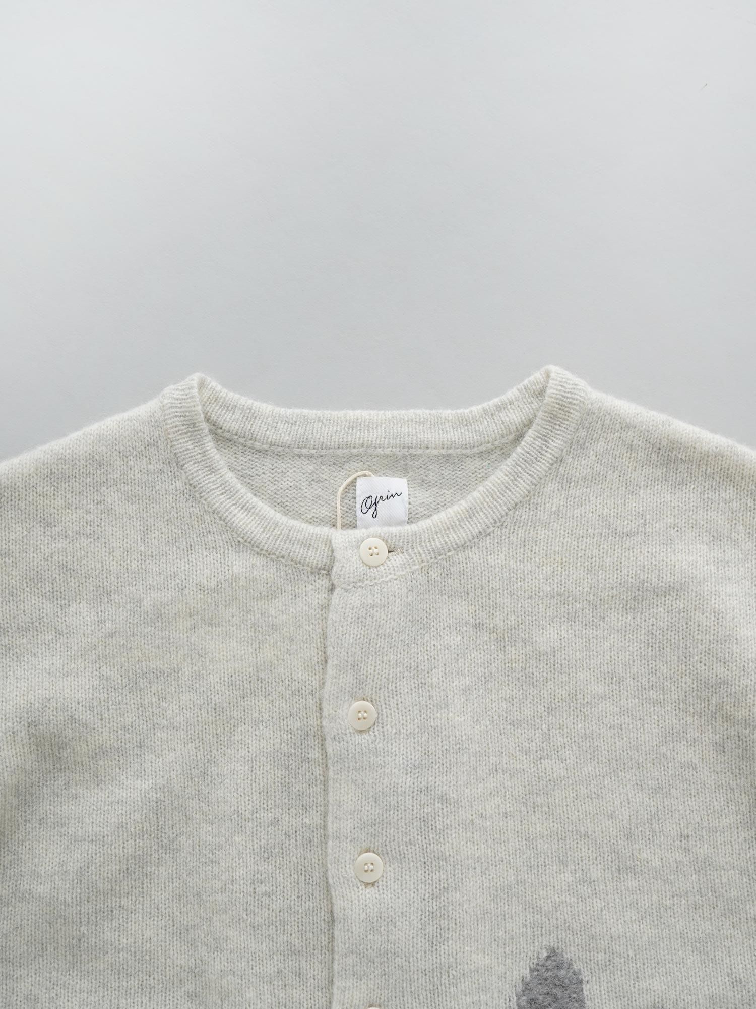 grinオリジナルの猫柄を立体感のあるジャガードで表現しています。思わず触りたくなるようなふわふわとした質感で、アイキャッチのようなインパクトのあるモチーフ。そんな存在感のある猫柄を馴染ませるベースのカーディガンは、肩が緩やかに落ちた程よくゆったりとしたサイズ感です。袖口と裾にリブ編みを利かせ、すっきりと見せる部分を作るだけでなく編み地に変化を付けました。しっぽが立ちこちらを向いた猫、ぽってりと座った様子の猫、左右それぞれの猫の絶妙な可愛さ。個性のあるスパイス要素を加えながらも、癖のない形と落ち着いたカラーリングで取り入れやすいニットカーディガンになっています。