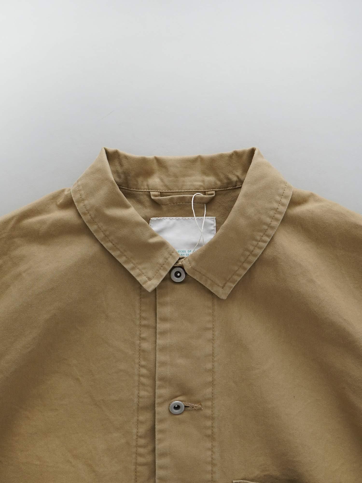 適度なハリと厚み、しなやかさのある生地感が特徴のソフトサージを使用したトラッカージャケット。Gジャンとカバーオールの中間のようなジャケットで、中にシャツやニットが着こみやすいゆとりのあるサイズ感になっています。前ボタンと後ろのタブにはそれぞれ異なるボタン仕様にし、少し下めに付けた胸ポケットや内側のポケットといった細やかなデザインを利かせました。組み合わせ次第でシーズンレスに着用することが出来ます。