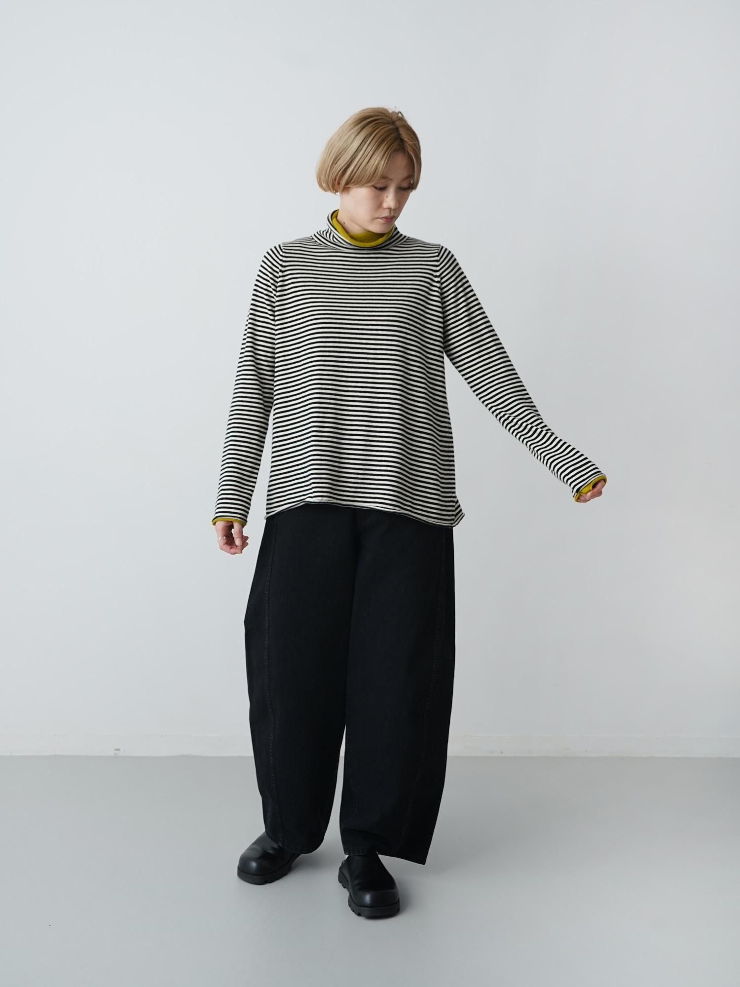 grinで人気のある綿カシミア。肌触りの良い滑らかな心地よさが魅力で、身体に張りつかないよう編み地やシルエットにもこだわっています。二枚のタートルをレイヤードしたような配色が楽しい個性派なデザイン。襟と袖口が二重になっているところが最大の特徴です。コンパクトに収めた肩幅と身幅は程よいゆったり具合に。ほんのりと広がるAラインと着丈の長さで、お腹周りをきれいにカバーする安心の一着です。肩回りをすっきりとさせているので、インナーとしても最適の便利なプルオーバーに仕上げました。