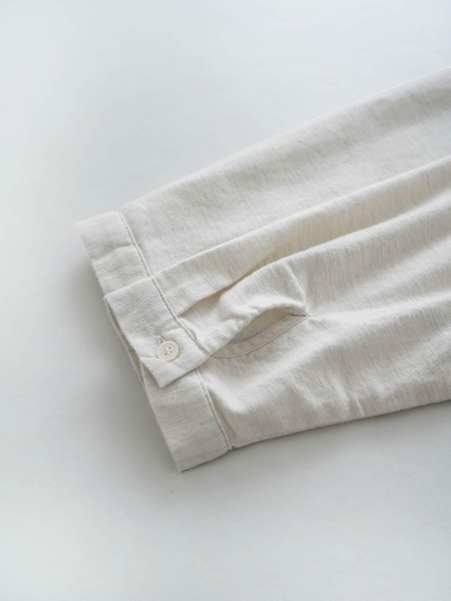 表面を起毛させた暖かみのあるコットンネル。ふっくらとした優しい着心地の良さと経糸と緯糸で異なる糸を使用することで表現する深みのある色合いが魅力です。カチッとした雰囲気ながらも、適度にゆとりを持たせた身幅とやや短めの着丈のボックスシルエット。薄手のニットを中に重ねる着こなしや軽い羽織のような感覚で使用することも出来ますが、カーディガンやジャケットのインナーシャツとして活躍するシャツになっています。左胸に施した小さなメガネのワンポイント刺繍がさりげないポイントです。