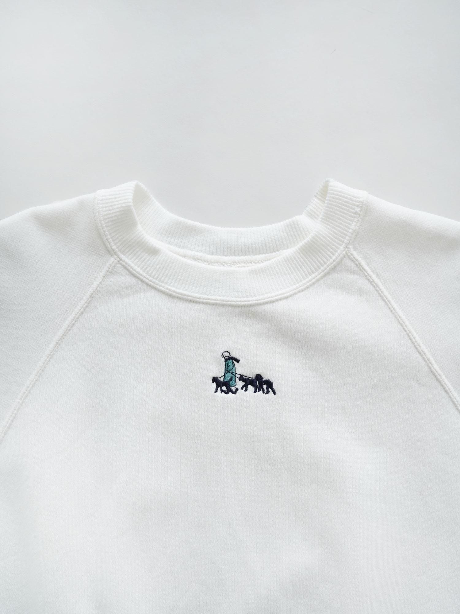 厚地すぎず薄地でもない、絶妙な生地の厚みが重宝する裏毛のスウェットプルオーバー。コーマ糸を使用することによって適度な光沢感があり、またゆっくりと編み上げふっくらとした風合いに仕上げています。シルエットもベーシックで肩回りが動きやすいラグランスリーブ。襟や袖口、裾といった部分にリブ編みを取り入れることで、メリハリを利かせすっきりと見える要素を作りました。身頃の上の方には、女の子が犬の散歩をしている刺繍と右裾にも振り返る犬の刺繍入り。着こなしに馴染む柔らかなカラー展開が合わせやすくなっています。