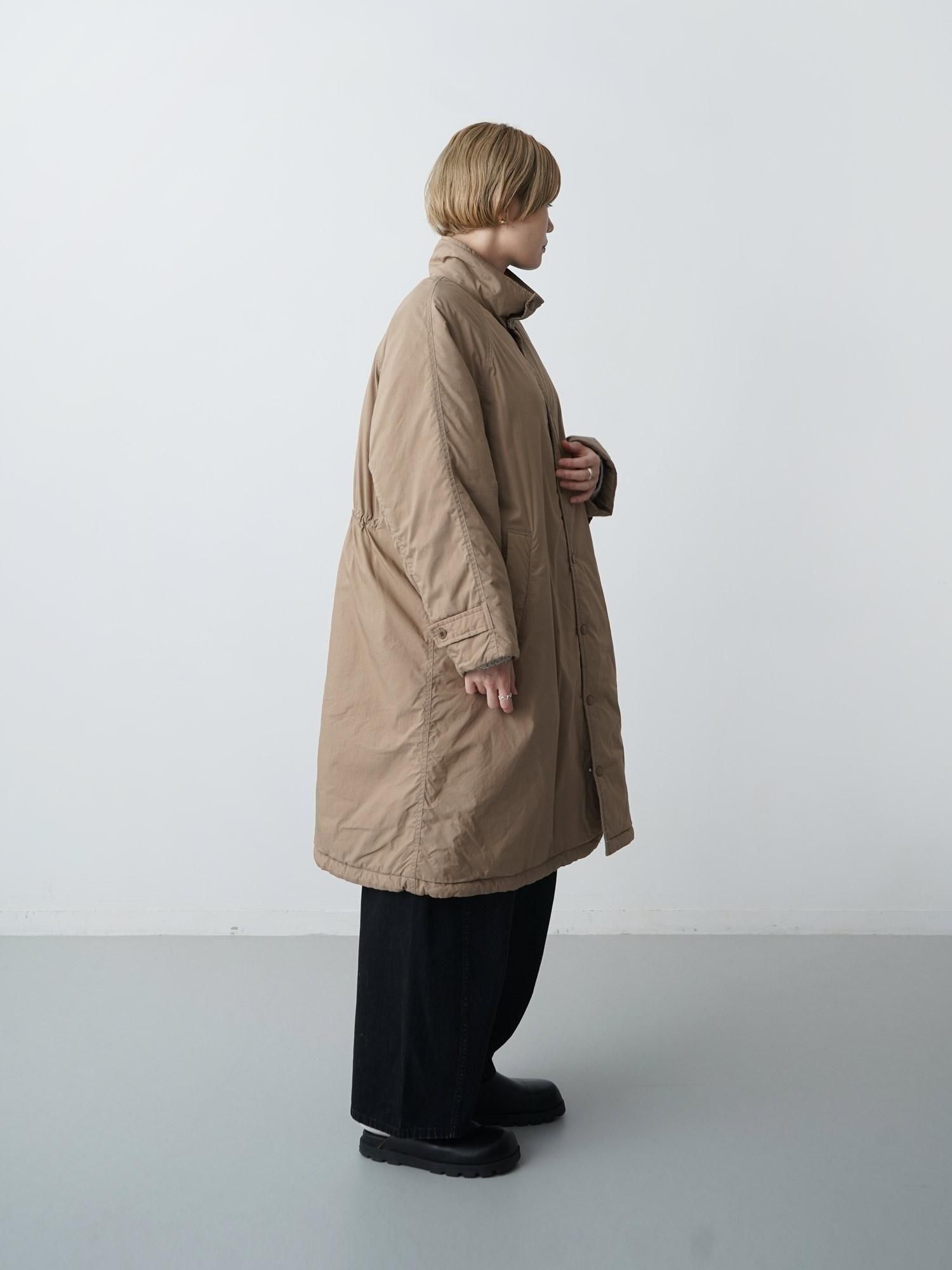表地にしなやか且つ軽やかさのあるコットンナイロンを使用。ナイロンが含まれていますが、光沢の少ないマットな質感で綿のような見え方が特徴になっている素材です。中に着込みやすいゆったりしたサイジングと縦のラインを綺麗に見せるコート。腰付近と裾に施したドローコードを絞ることで変化を付けることができ、コクーンのようなほんのりと丸み帯びたシルエットに。襟元まで全て留めるときちんとした印象を与えるスタンドネック、ボタンを開けてラフな雰囲気を楽しむ着こなしも〇一見すると薄手なコートに見えますが、裏地に中綿キルトの生地を取り入れしっかりと暖かさを兼ね備えたアウターに仕上げました。両袖口周りにボタンを2つ付け、こちらも調節が可能になっています。