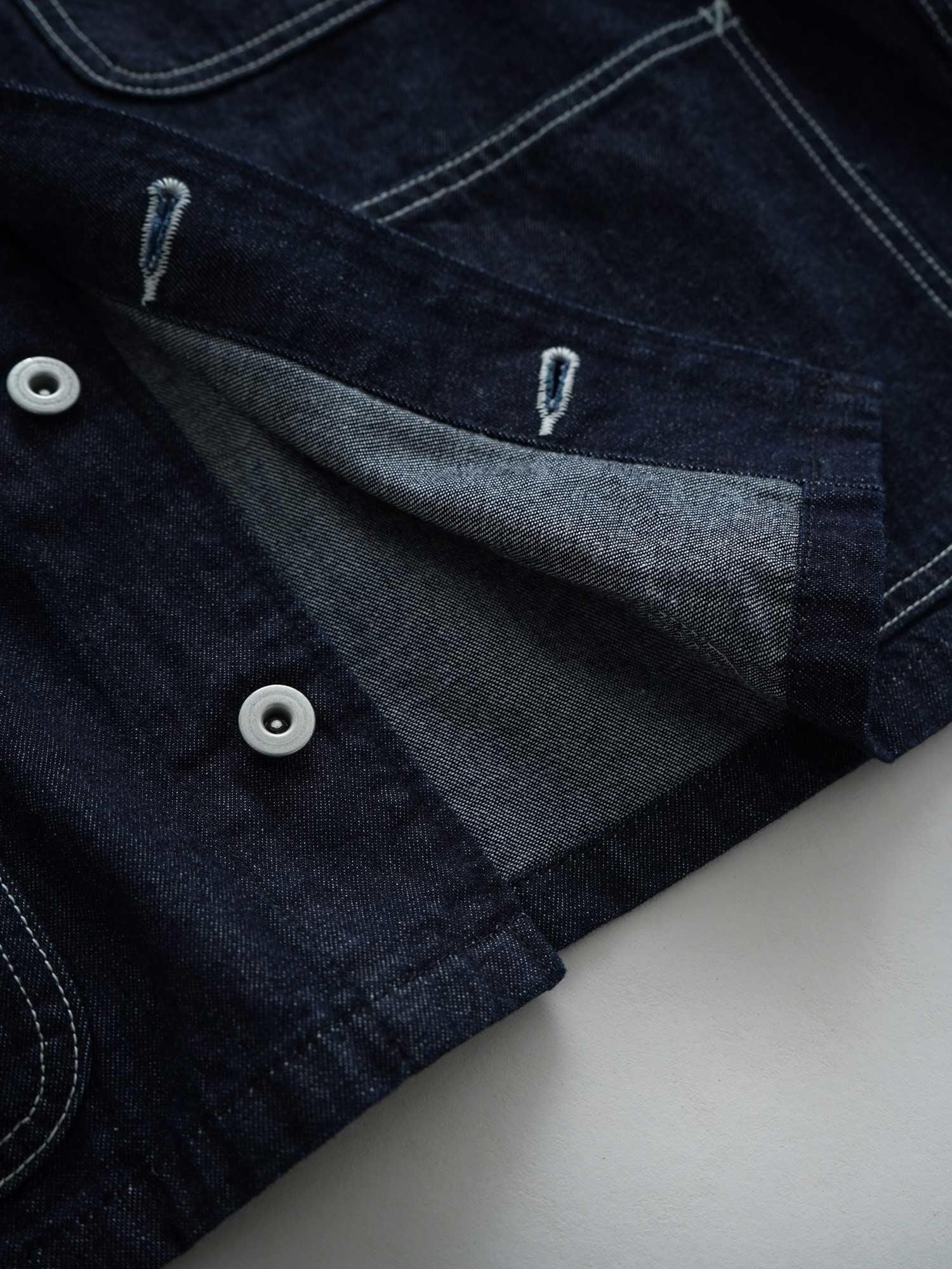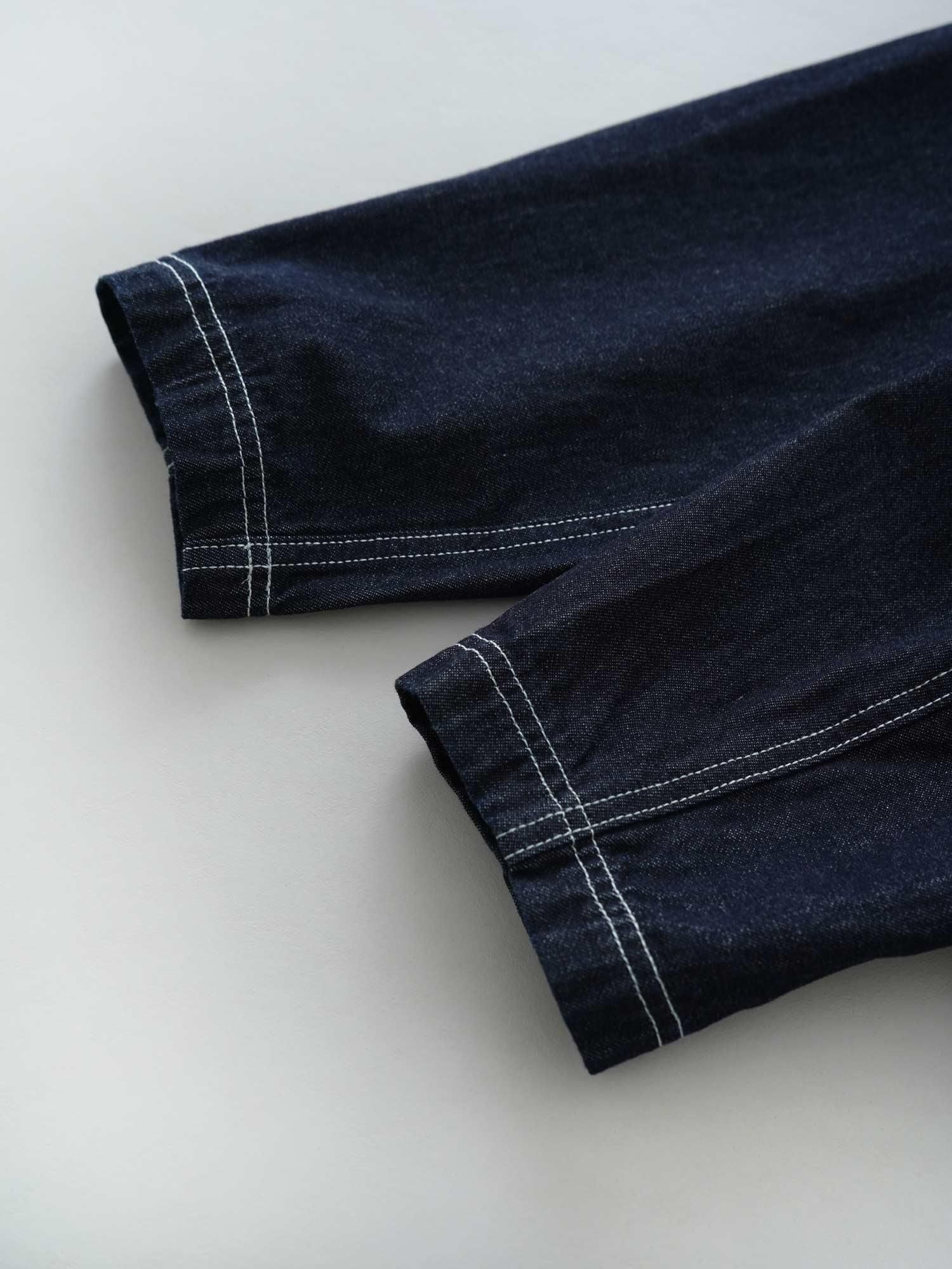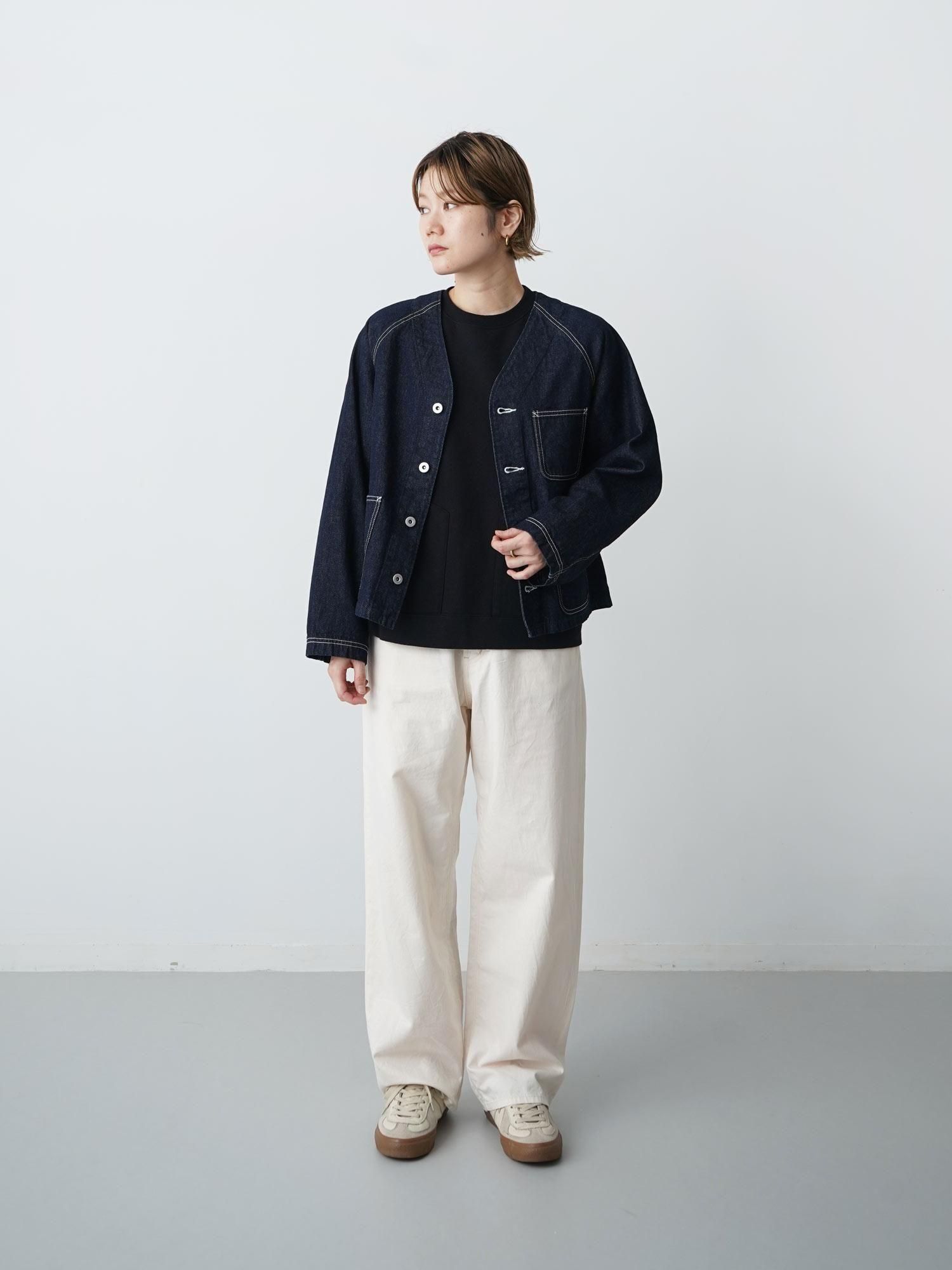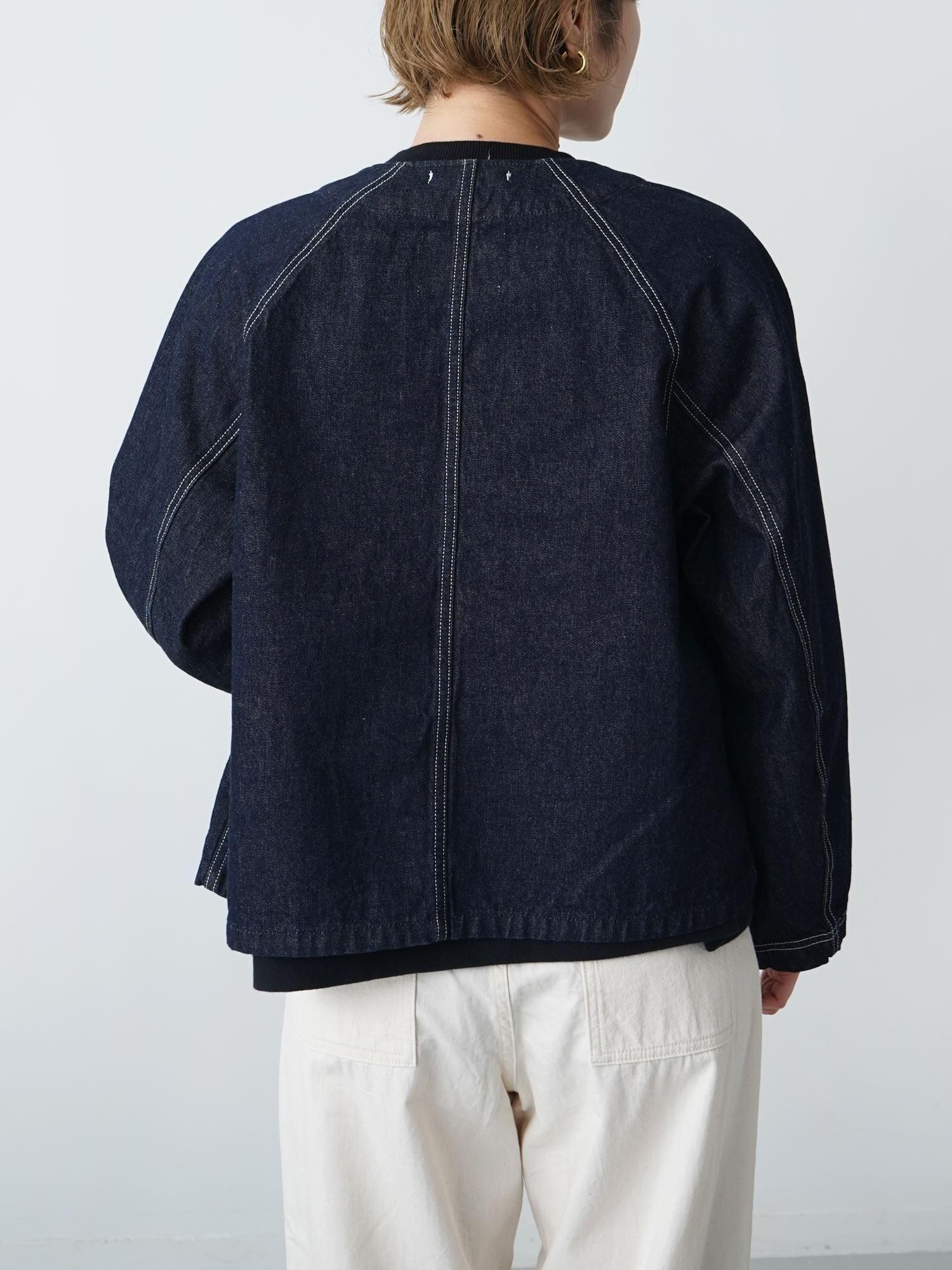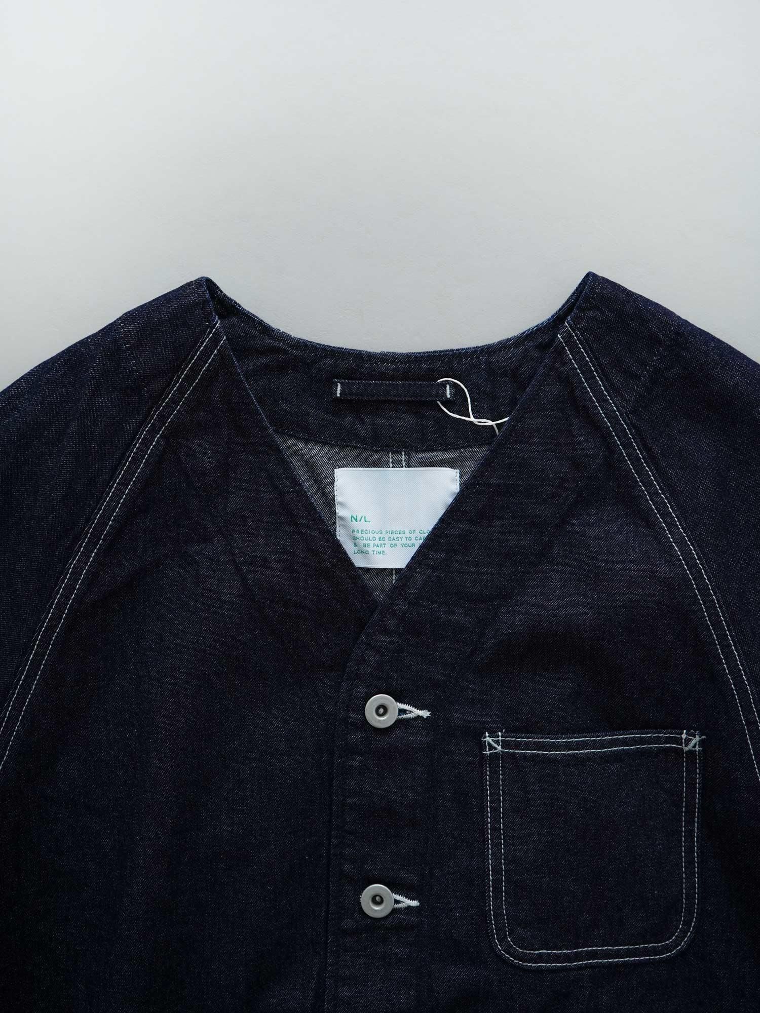 一般的なデニムよりもやや薄く、柔らかさとコシを兼ね備えた長い期間活躍する10ozデニムを使用。古着のエンジニアジャケットをベースとし、ジャケットとカーディガンの間をとったような感覚で着ることが出来る一着です。N/Lらしく日常に沿ったラフな気軽さも大切にしながら、部分的に利かせた配色のステッチワークやポケットの位置などカジュアルなバランスにこだわりを込めました。ジャケットに合わせるインナーとして厚みのあるカットソーやニットが重ねやすくなるように、パカッとしたラインにアームホールを広めに取っています。