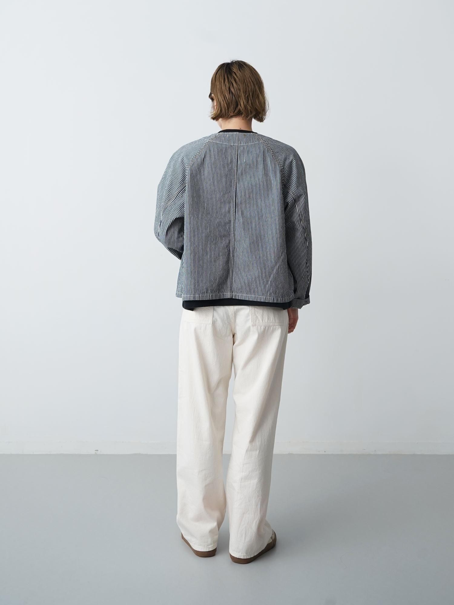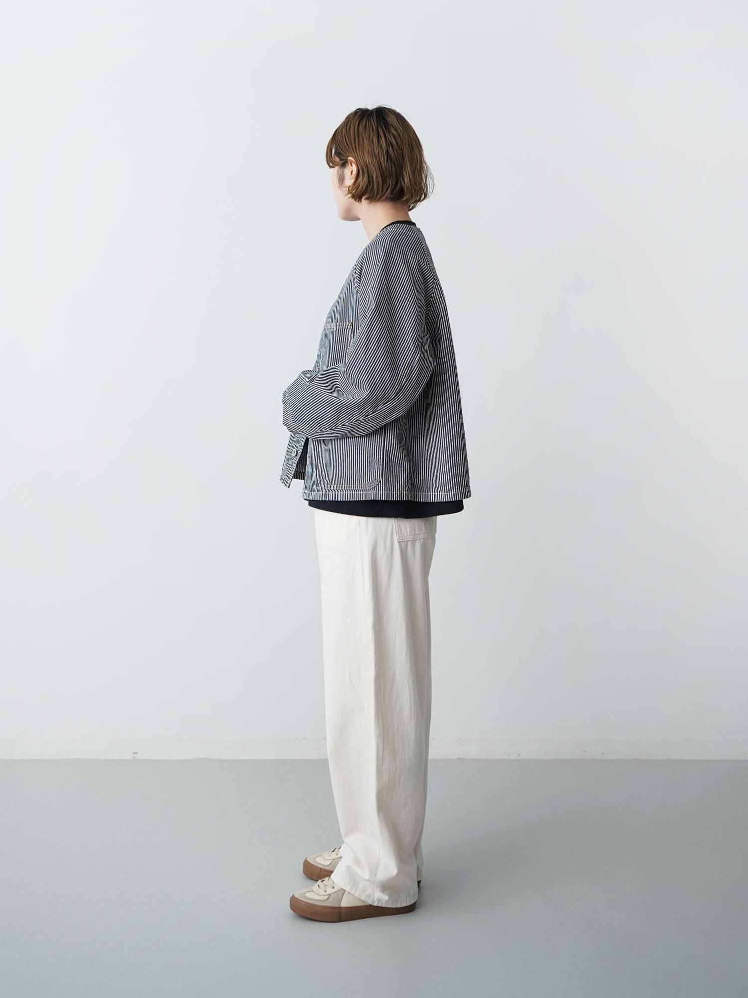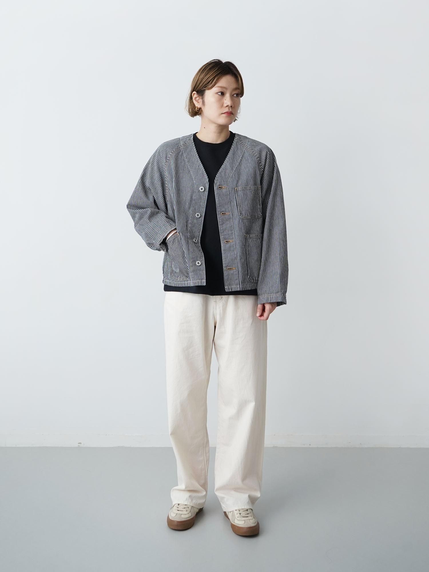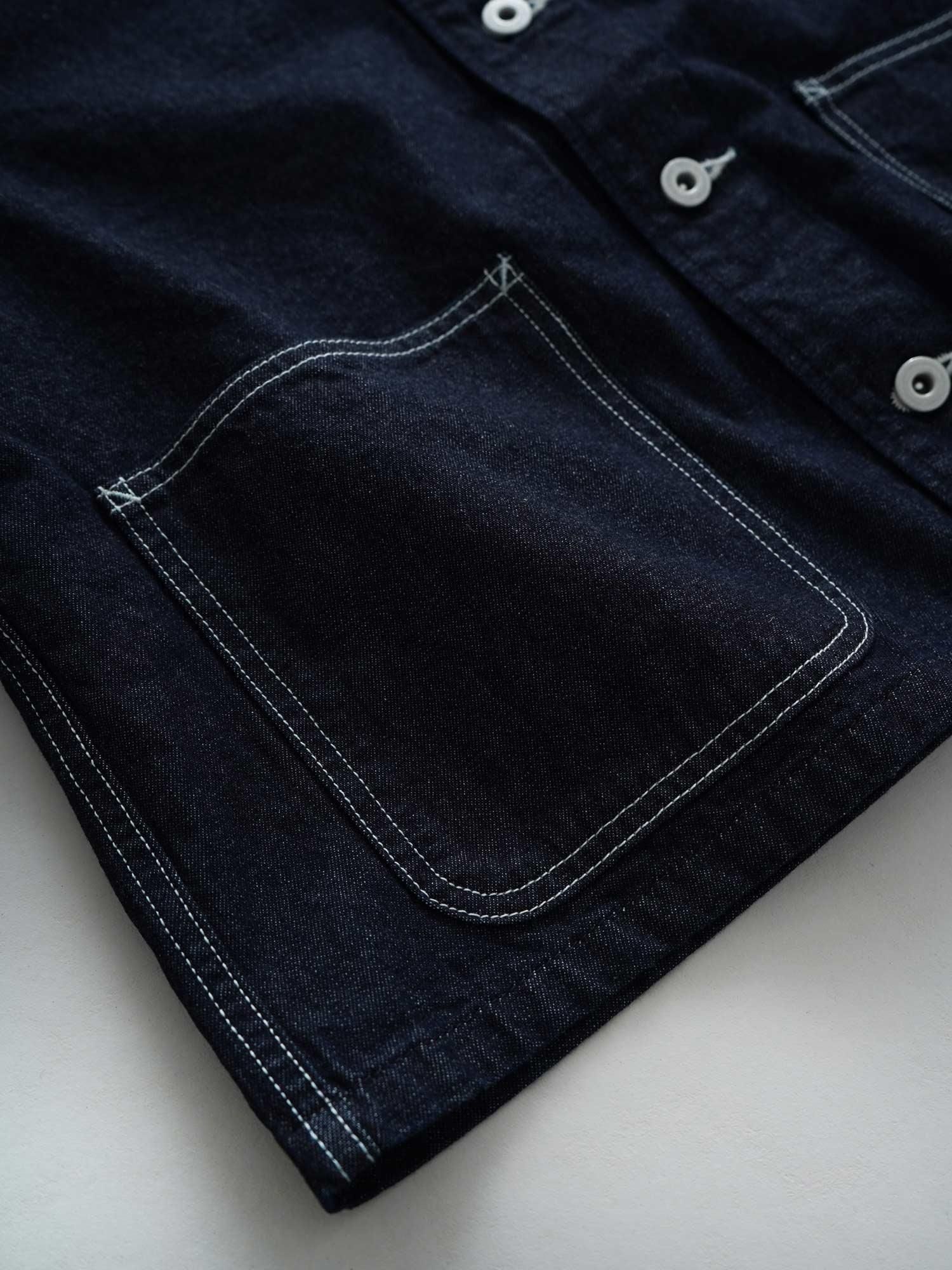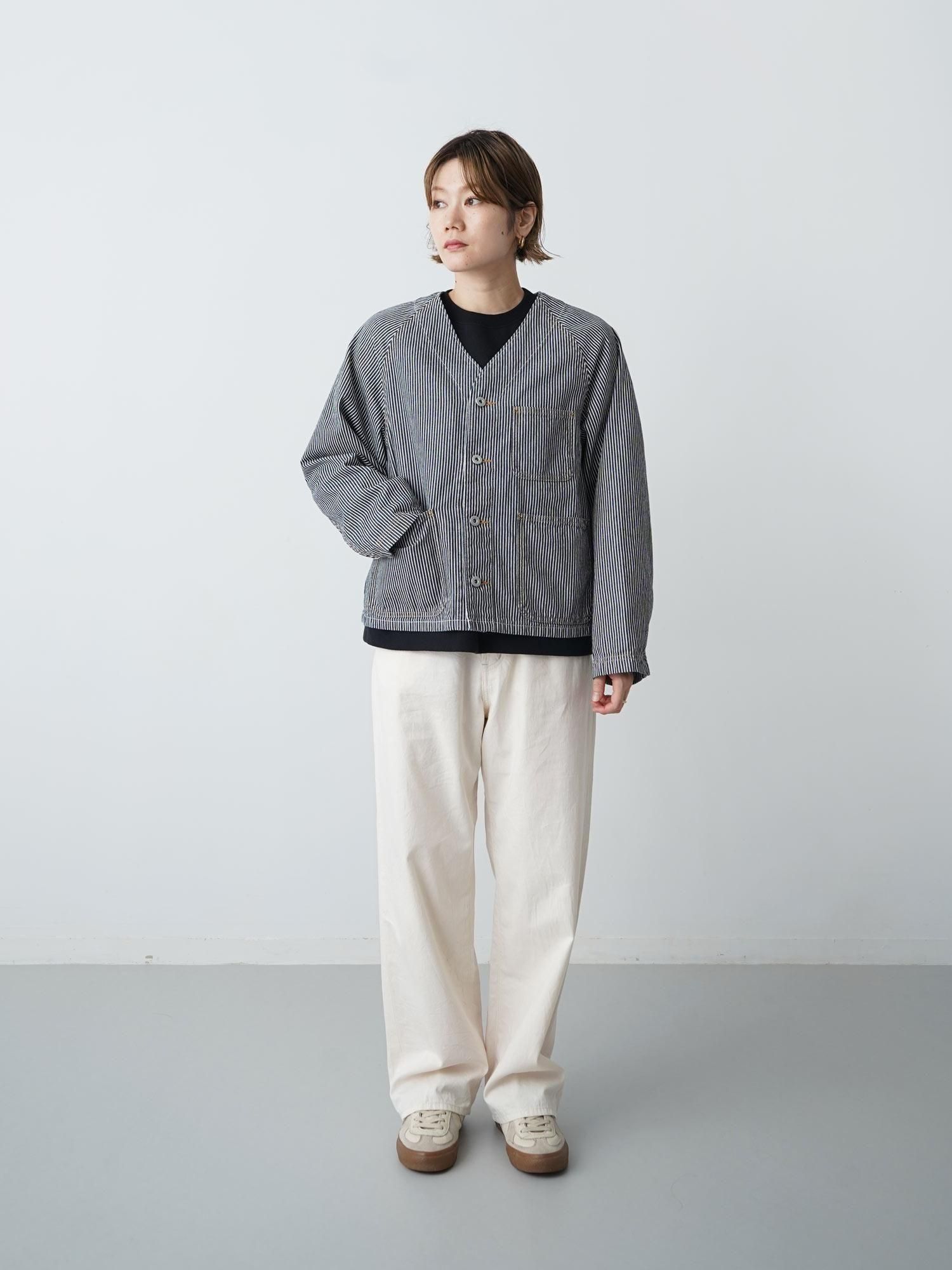 一般的なデニムよりもやや薄く、柔らかさとコシを兼ね備えた長い期間活躍する10ozデニムを使用。古着のエンジニアジャケットをベースとし、ジャケットとカーディガンの間をとったような感覚で着ることが出来る一着です。N/Lらしく日常に沿ったラフな気軽さも大切にしながら、部分的に利かせた配色のステッチワークやポケットの位置などカジュアルなバランスにこだわりを込めました。ジャケットに合わせるインナーとして厚みのあるカットソーやニットが重ねやすくなるように、パカッとしたラインにアームホールを広めに取っています。