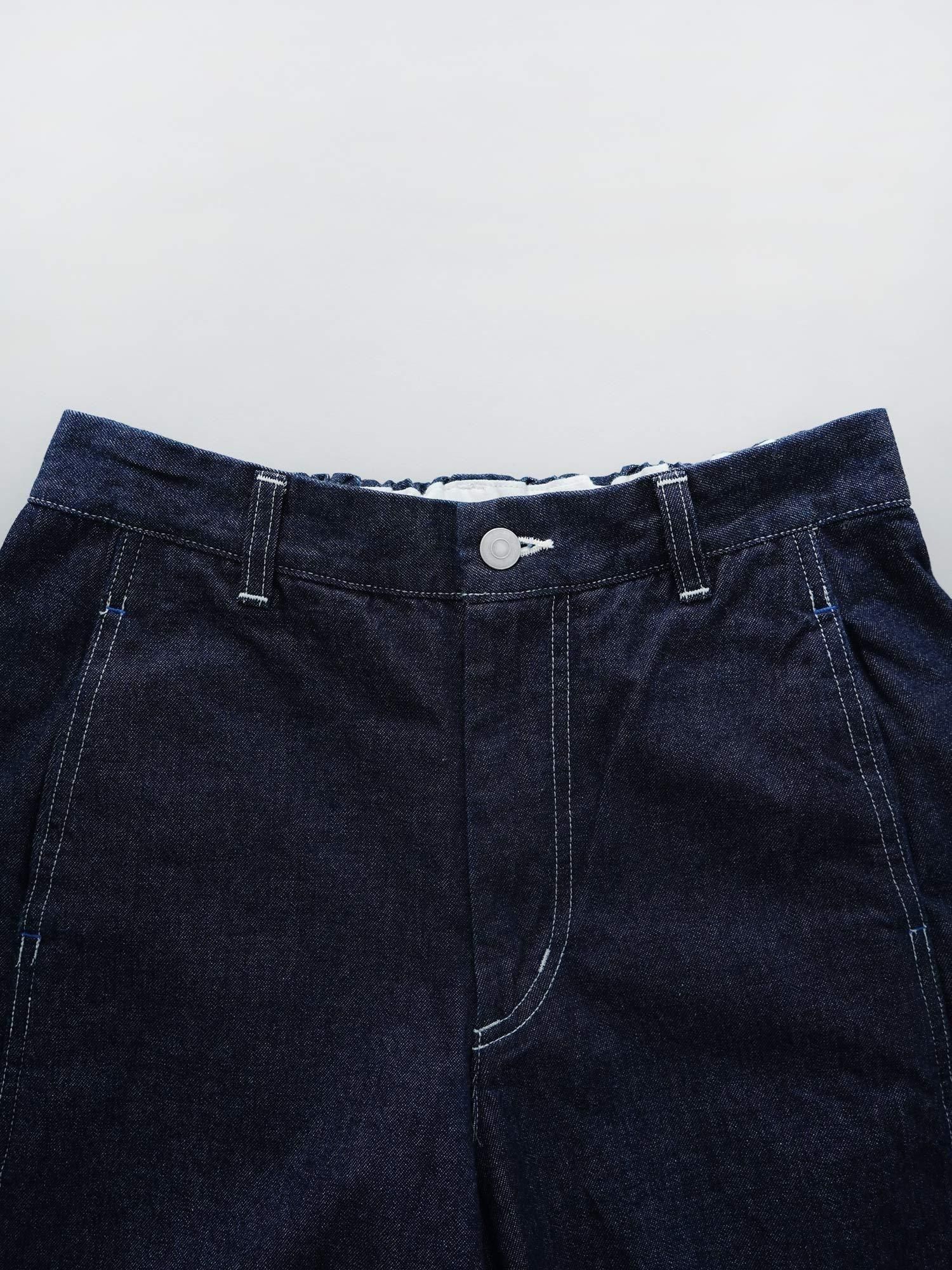 10ozデニムは一般的なデニムよりもやや薄く、柔らかさとコシを兼ね備えたオールシーズン穿くことが出来る生地感になっています。身体に馴染みごわつかない穿き心地が魅力のクロップドコームパンツ。両サイドの切り替えを前に持ってくることにより、櫛(コーム)のようなほんのりカーブを描いたテーパードのようなラインが特徴です。後ろポケットの飾りネームやワークデニムらしいWステッチを利かせた細部のこだわりがポイント。通常のデニムよりも柔らかな素材感から無骨な雰囲気になりすぎず、取り入れやすい一本に仕上がりました。同素材のエンジニアジャケットと合わせた着こなしもカッコよく決まります。