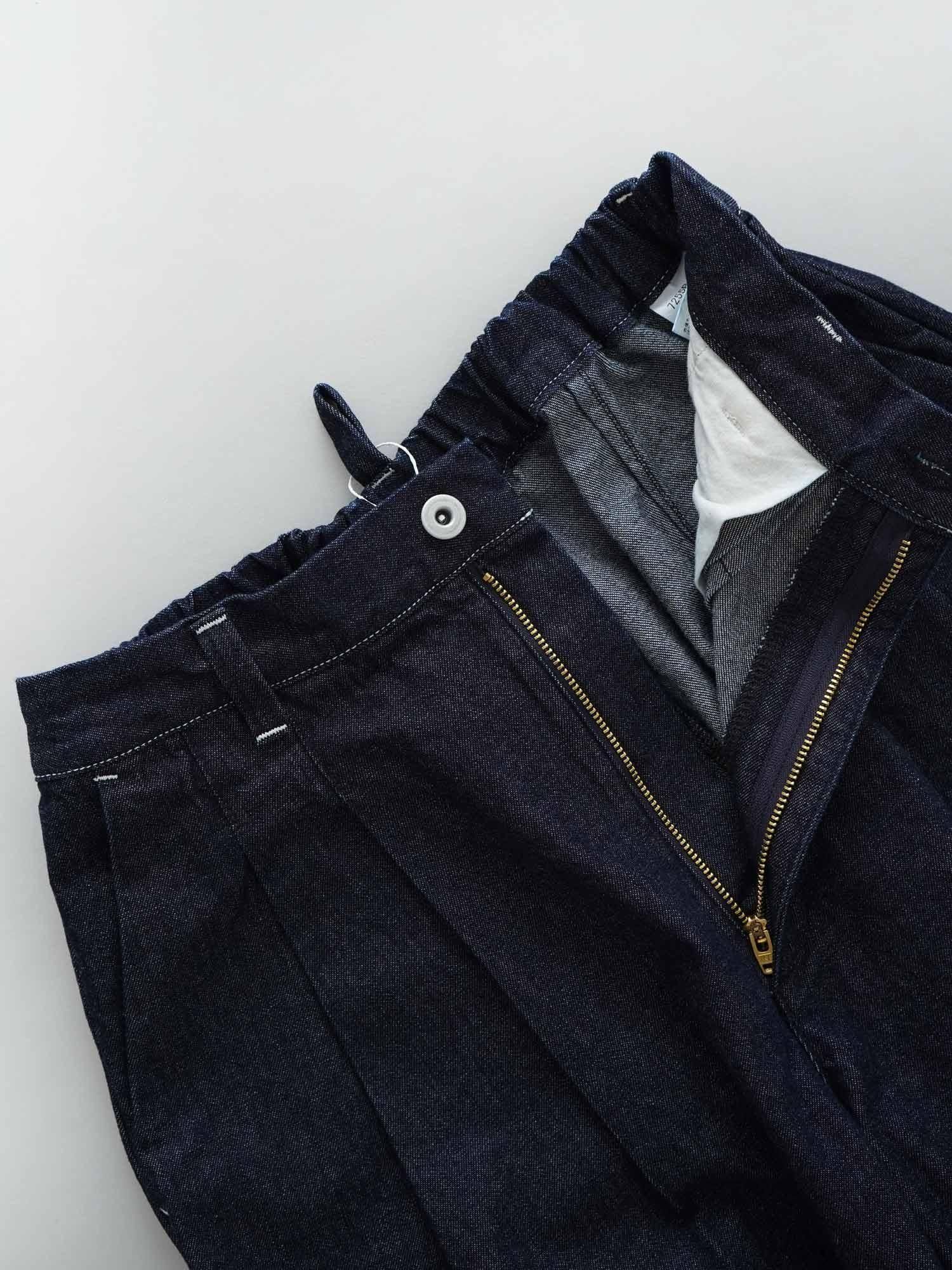 身体に程よく馴染みごわつかない穿き心地の10ozデニムを使用したダイヤパンツ、柔らかさとコシを兼ね備えた丈夫な作りになっています。錐台のように下側にボリュームを持たせたシルエットがきれいで、膝幅にゆとりがあり裾が少しすぼまるダイヤ柄のような形から名付けています。サイドに付いたポケットの端を隠すほどの大きなタックが入り、どこかミリタリーパンツを彷彿とする素材感とディティールを組み込みつつも、生地の緩やかな落ち感が上品な大人のデザインパンツが完成しました。配色のステッチを入れる箇所を限定することで、カジュアル感がありながらもきれいに穿いて頂けます。