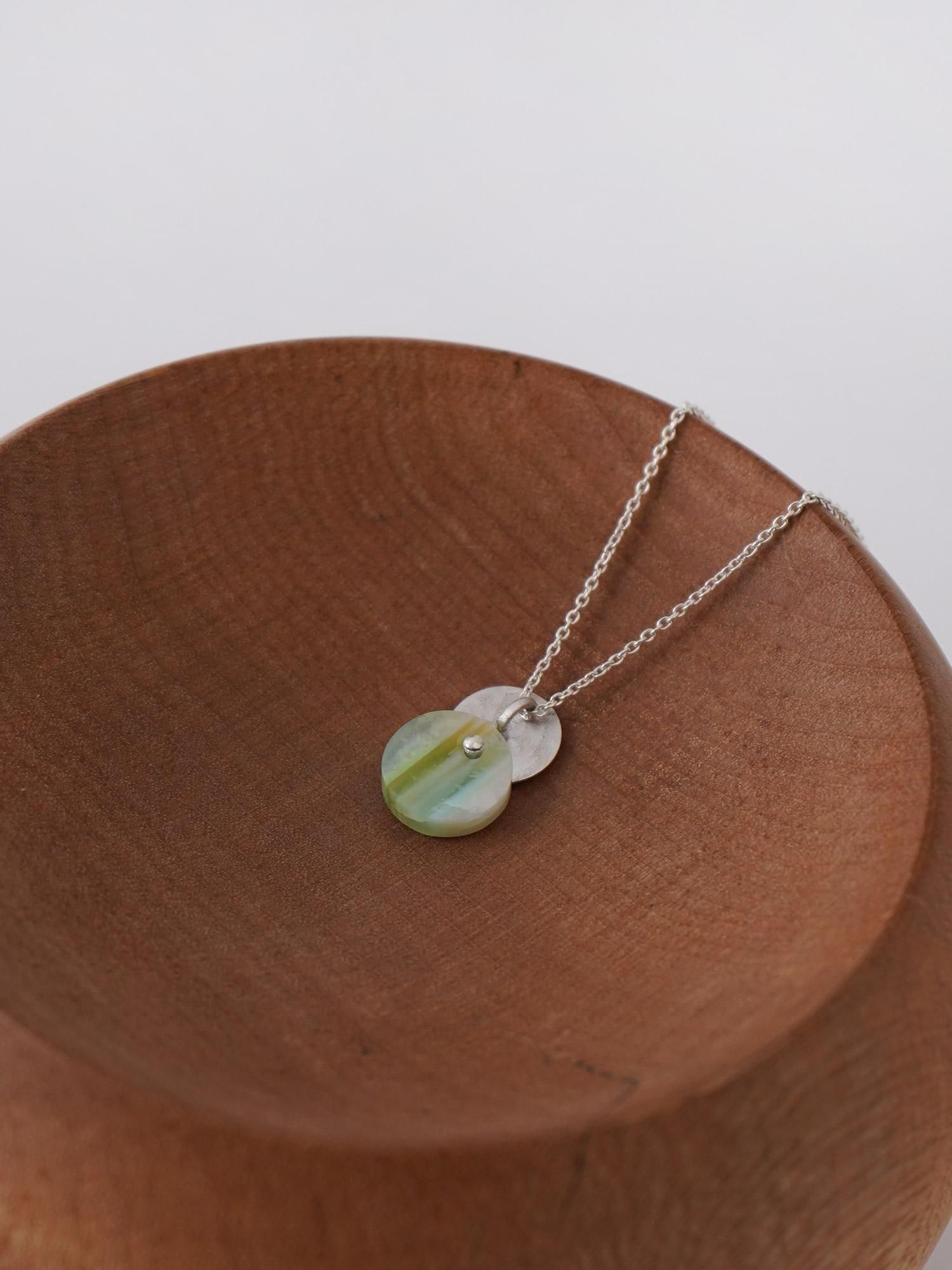 「人に馴染むような、寄り添えるような小物」をコンセプトとしたアクセサリーブランド、鶫tsugumi 銀小物製作所からHalosシリーズのネックレスが届きました。生きとし生けるものに射す光の輪、後光を意味するHalos、いつか見た光を忘れないよう形にしたいという想いから作られました。淡い色味のグラデーションが美しい天然石は、甲府にある網倉天然石のものを使用。メノウやアゲートなどの石を独特の感性で切り出し個性的にカットからデザインに繋げていく工程にこだわりを感じることが出来ます。石の魅力を最大限活かせるように組み合わせるパーツをシンプルにしています。パーツ同士が一点のみで留まり、可動するような仕様がポイント。動きのある軽やかな印象です。ネックレスの留め具には"鳥"モチーフのデザインが施され、引き輪部分は大きめに作られているので通常の留め具よりもラクに止められます。チェーンを短めにして鳥モチーフの留め具を垂らすと、後ろ姿のアクセントに。細部までさりげない遊び心が心をくすぐります。石染めの技法により染めることで、石の色味にも独特な風合いが表現され、他にはないアクセサリーに。まさに一期一会という言葉がピッタリとはまります。天然石の上質さはありながら、日常に自然と溶け込むような、気軽につけられるネックレスに仕上がっています。