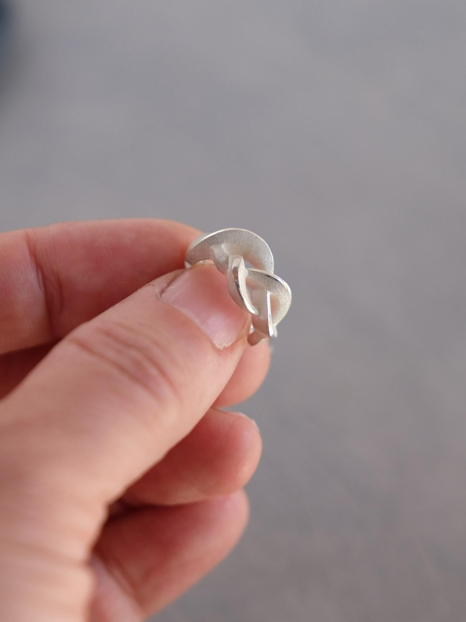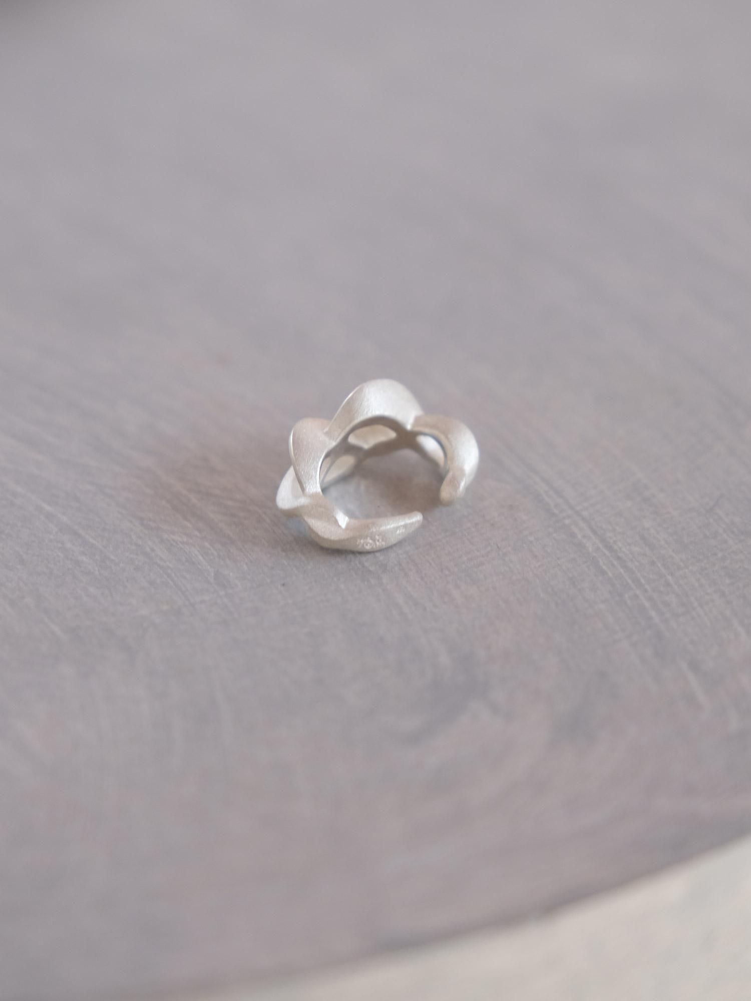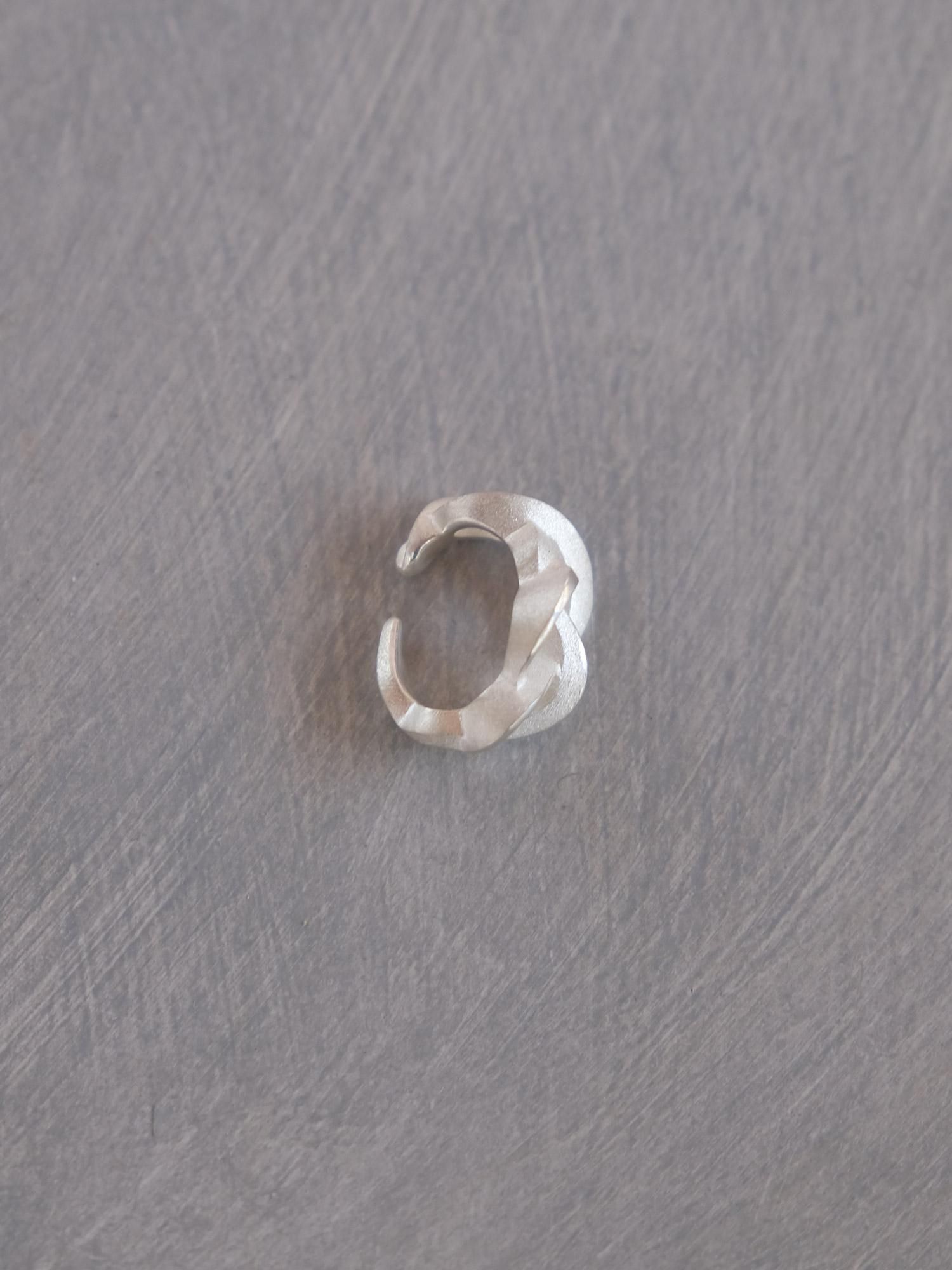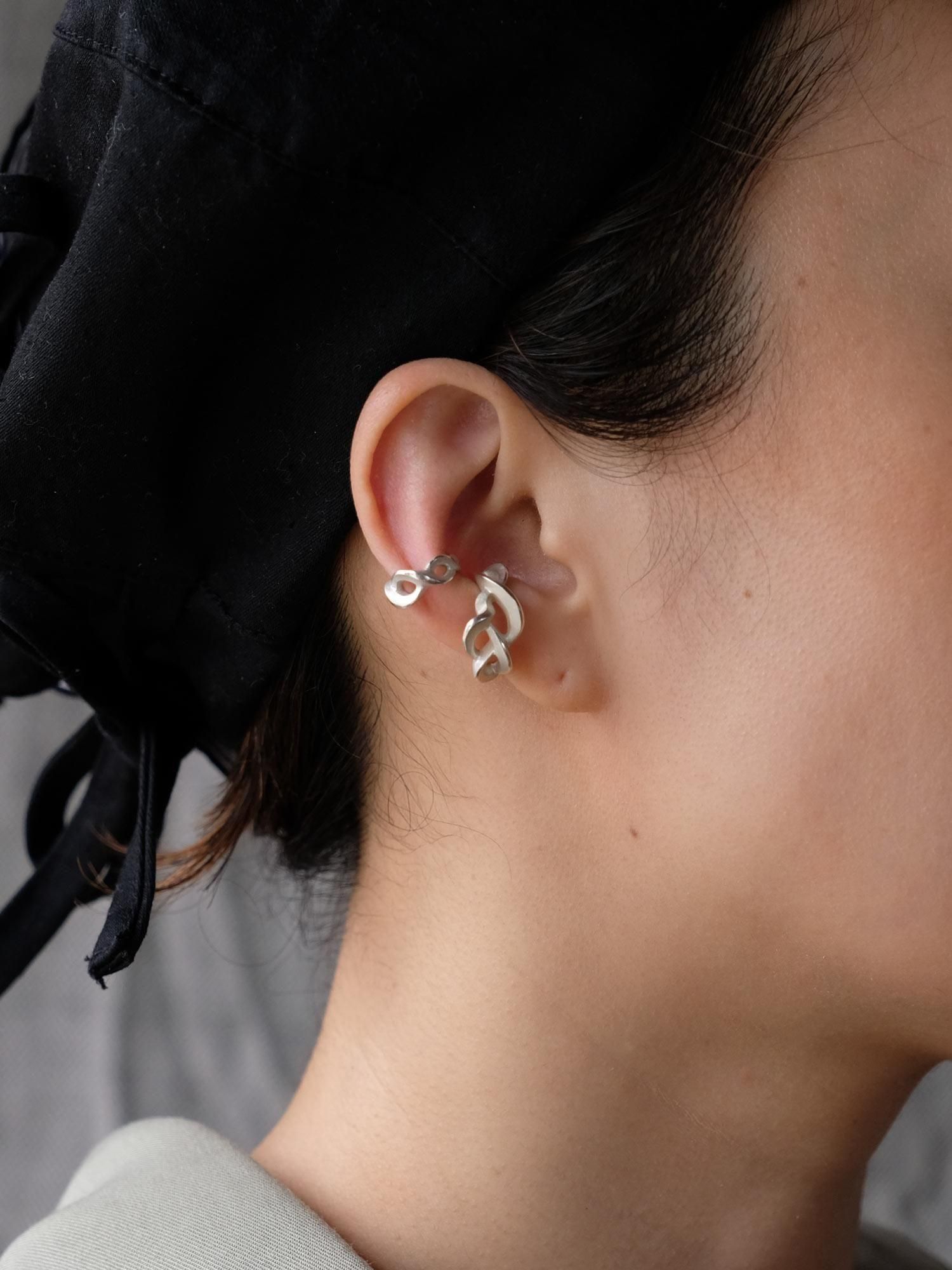入り組んだ曲線を小さな波のうねりのように表現したデザインのイヤーカフです。このイヤーカフの形は耳たぶに近いところ(耳の下の方)に収まるデザインになってます。透かし模様のような、繊細も少し残しつつ、厚みや高さに強弱をつけた立体表現によりしっかりしたボリュームの印象のあるイヤーカフです。