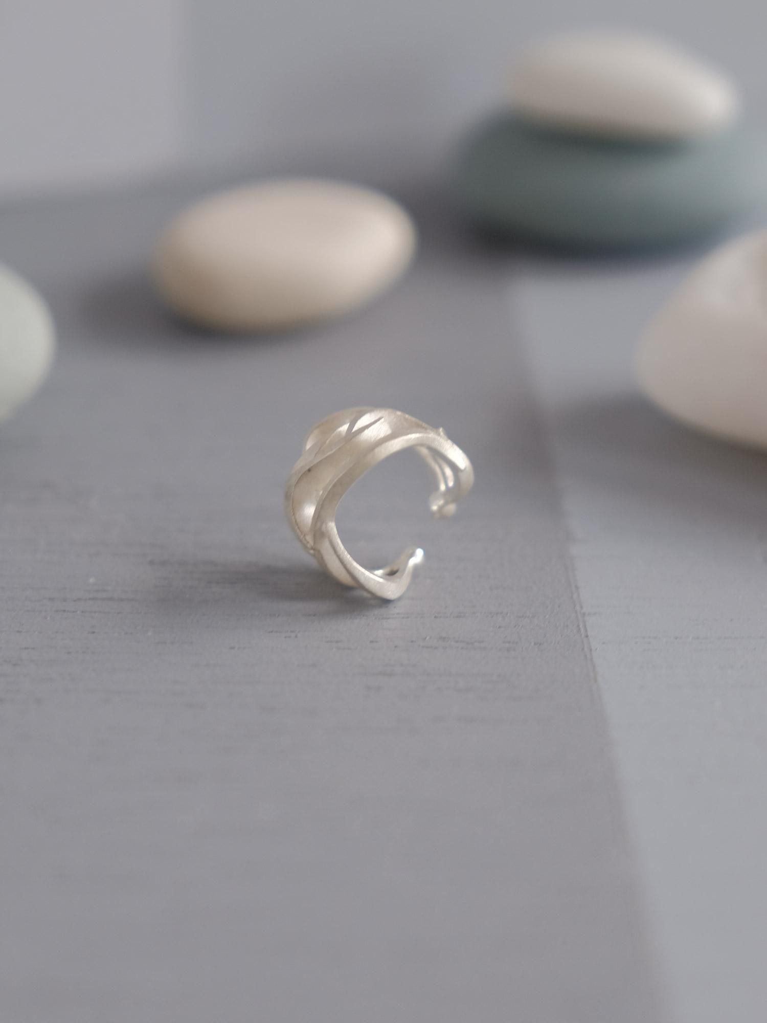全体に透かし模様が入っているシルバーのイヤーカフです。古建築などにたまに見られる彫刻装飾の欄間の複雑な入り組み方など参考に、波をイメージした透かし模様を作りました。よく見ると厚みに高低差があり、さまざな角度で見ると細やかな凹凸が、デザインに一層立体感を際立たせていると同時に、服や何か物などに引っ掛かりにくよう計算された厚みや入り組み方でもあります。曲線模様の透かしですが、模様一つ一つの角にエッジが効いているので、柔らかすぎない雰囲気で、女性にはもちろん、男性が身につけても。エレガントで存在感のあるイヤーカフ、表面は梨地(なしぢ)仕上げといい、梨のように少しプツプツしたようなテクスチャーが入っていますが、使用しているうちによく擦れる凸部分や、エッジの出ている部分など自然と磨かれ光っていきます。