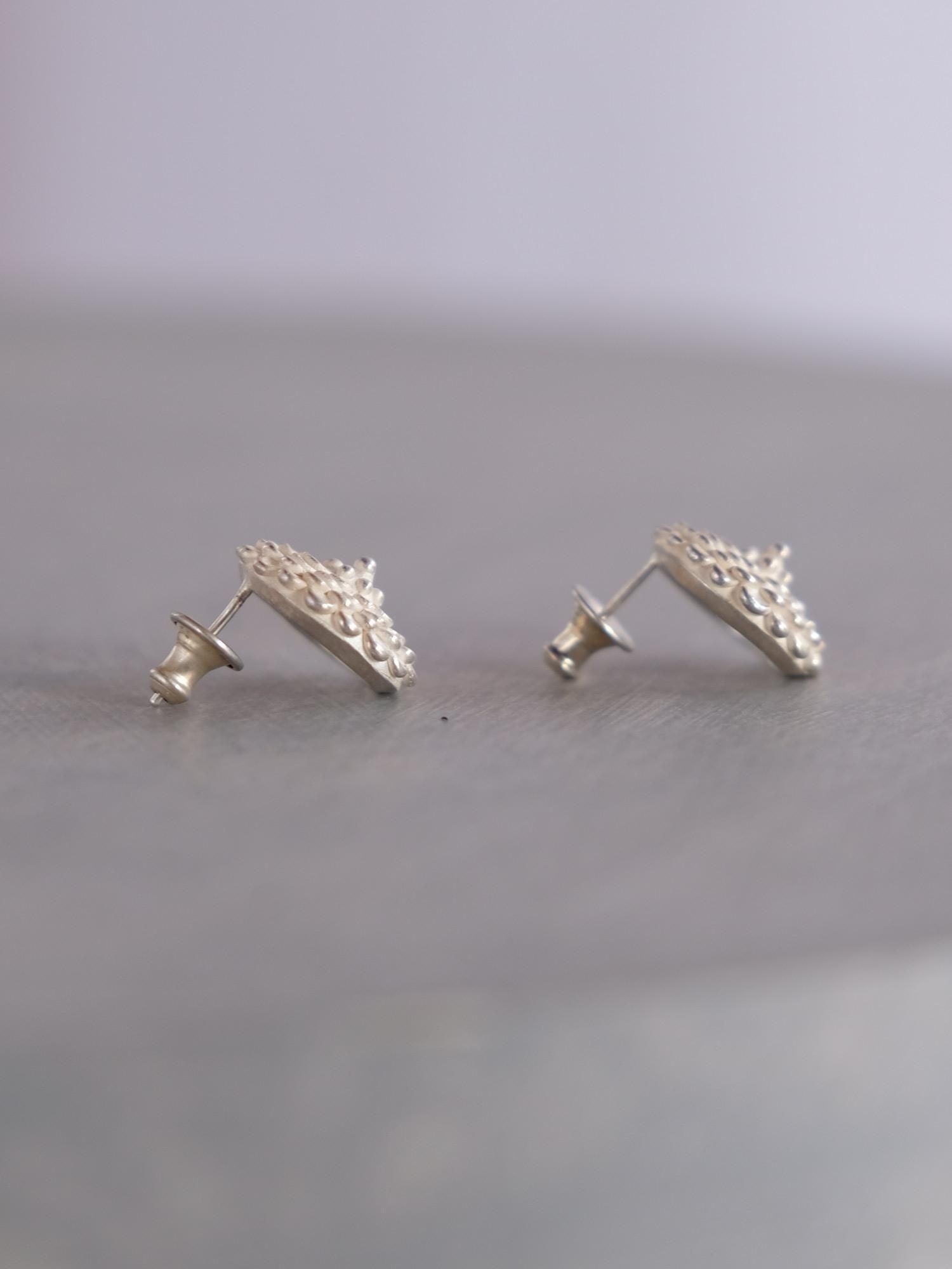 幾重にも重なる花びらから華やかさをを感じます。鋳造の工程で発生する膜によりシルバーの表面が白仕上げですが、花びらの縁の部分は磨いて光らせてあります。経年変化により、徐々に燻しが出てきて、より立体感を強調されていきます。パーティーなどのきらびやかな場所でも、和装にも、普段使いにもどんなシチュエーションでもさりげない存在感を演出します。