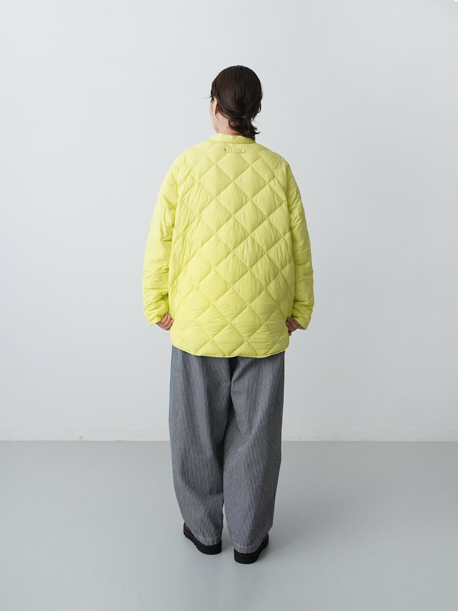 昨年大人気だったN/Lのダウンジャケットが今年も登場しました。サッと羽織ることが出来たり、コンパクトに持ち歩いたりと日常生活で使いやすい薄さと軽さを重視した20D(デニール)ナイロンを使用しています。ほんのりと高さのあるスタンドカラーにラウンドした裾のラインなど、部分的にシャツのような要素を取り入れることでカジュアルに着やすいジャケットを作りました。肩回りや身幅を広くとってあるので、中にもしっかりと着込むことが出来ます。表裏どちらでも使えるリバーシブル仕様、裏側はキルティングのステッチがなくマットな印象に。異なるそれぞれの色合わせが楽しく、さりげなく覗く配色部分が個性として光ります。