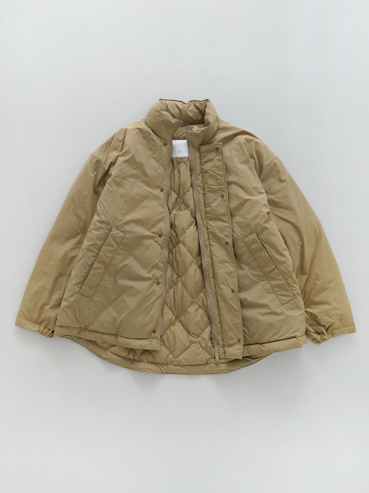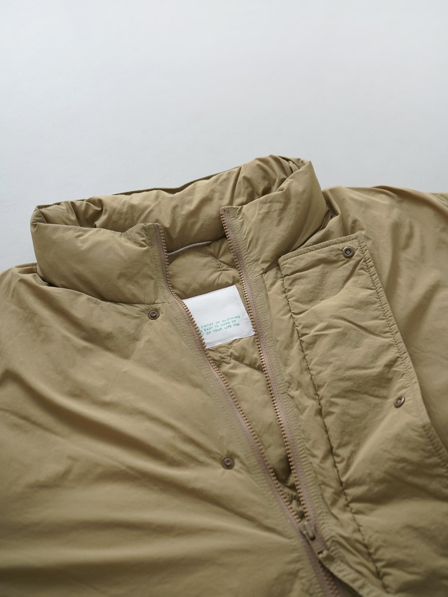 N/L定番のダウン。日常生活で使いやすい薄さと軽さを重視した20D(デニール)ナイロンを使用しています。ほんのり高さのあるスタンドカラーにお尻が隠れる前後差の付いたミドル丈でミリタリーのモンスターパーカーをデザインソースにしています。ラウンドした裾にはシルエットに変化が付けられるゴムコード入り。表側はステッチを無くしマットな質感が際立つ作りになっており、肩回りや身幅を広くとってあるので、中にもしっかりと着込むことが出来ます。軽くて着心地の良いダウン、デイリーに便利に着回せる一着に仕上がっています。