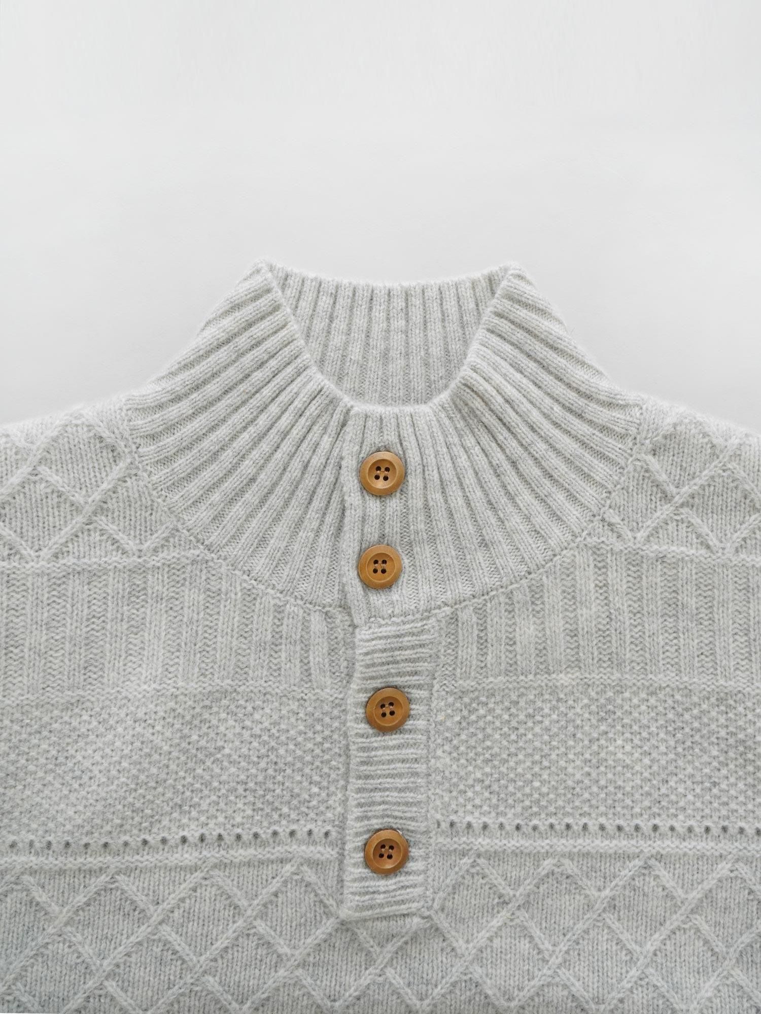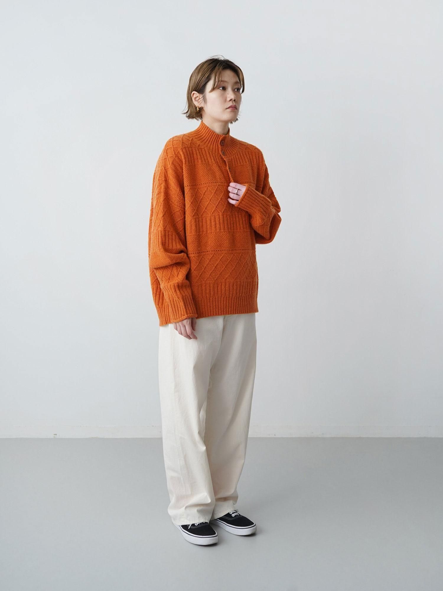 厚すぎず薄すぎない、程よい肉厚感が着やすいミドルゲージのラムナイロン、柔らかな軽さと保温性を兼ね備えたニットです。やや高さのあるハイネックにボタンを付けてヘンリーネックにしたプルオーバー、木のボタンが暖かみをプラスしてくれます。アラン柄は編地の変化によって付けた柄なので、シンプルながら一味違った表情に。ハイネックを開いて襟の様な形にすると雰囲気に変化が出て着こなしを楽しむことが出来ます。ゆったり具合が着やすいプルオーバー、シャツやタートルなどのインナーも重ねやすいので、レイヤードをした着回しもおすすめです。