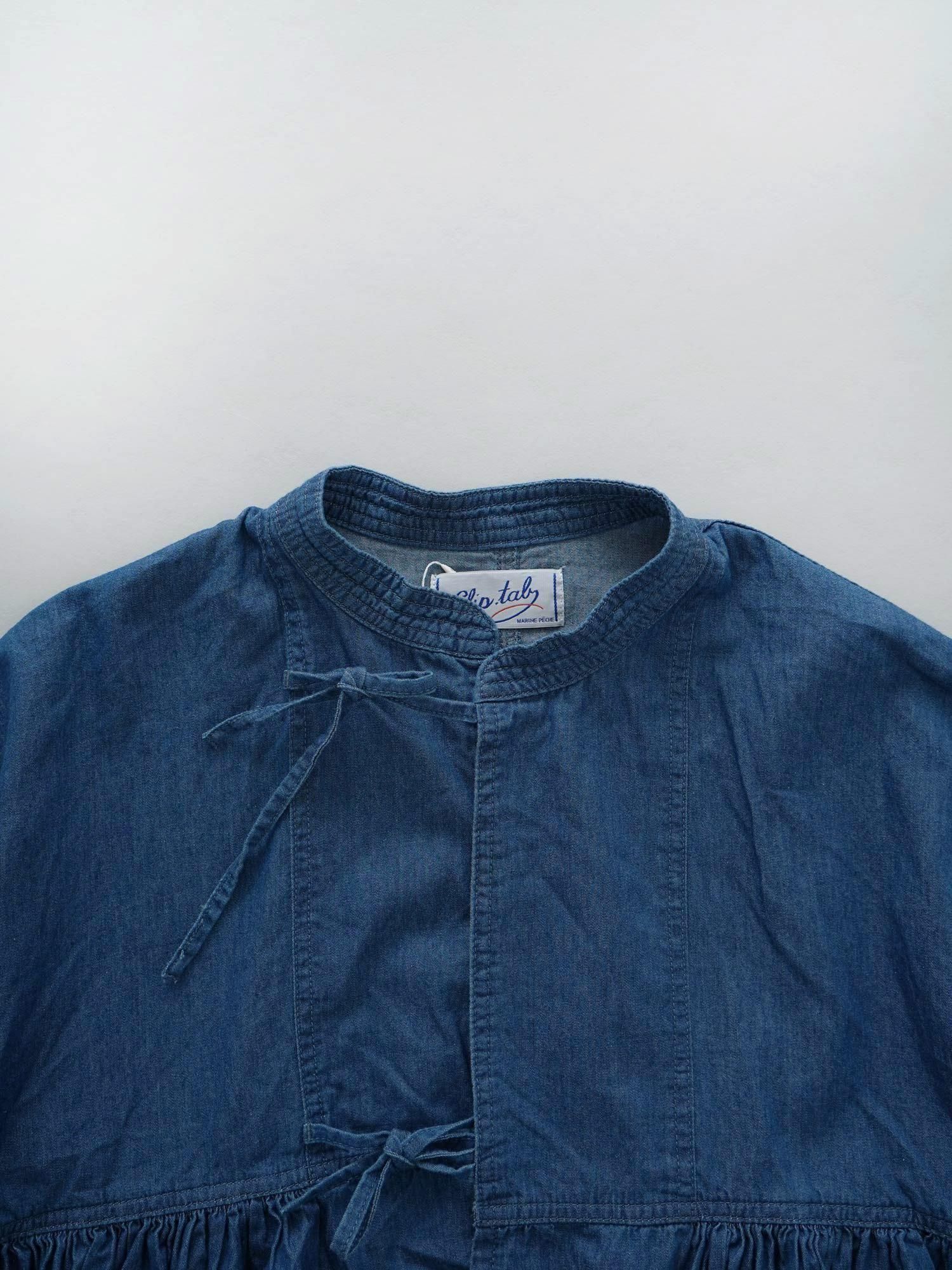 薄手ながらしっかりと目の詰まった、シャツ地のライトオンスのデニム。柔らかな着心地に通気性の高さも特徴になっています。ウエストラインよりやや上から入ったたっぷりのギャザーが、ナチュラルな雰囲気と華やかさを合わせ持つカシュクールタイプのシャツです。緩やかに落ちた肩のラインとややゆとりのある身幅、太すぎない袖のバランスが絶妙です。リボンで留めて一枚で着るのはもちろんTシャツやワンピースに袖を捲ってラフに羽織るだけでもこなれた雰囲気に。アクセントになるディティール要素が含まれてはいますが、インディゴのカラーが合わせやすく様々な着こなしに沿う形になっており、ロングシーズン重宝するストリングシャツが完成しました。