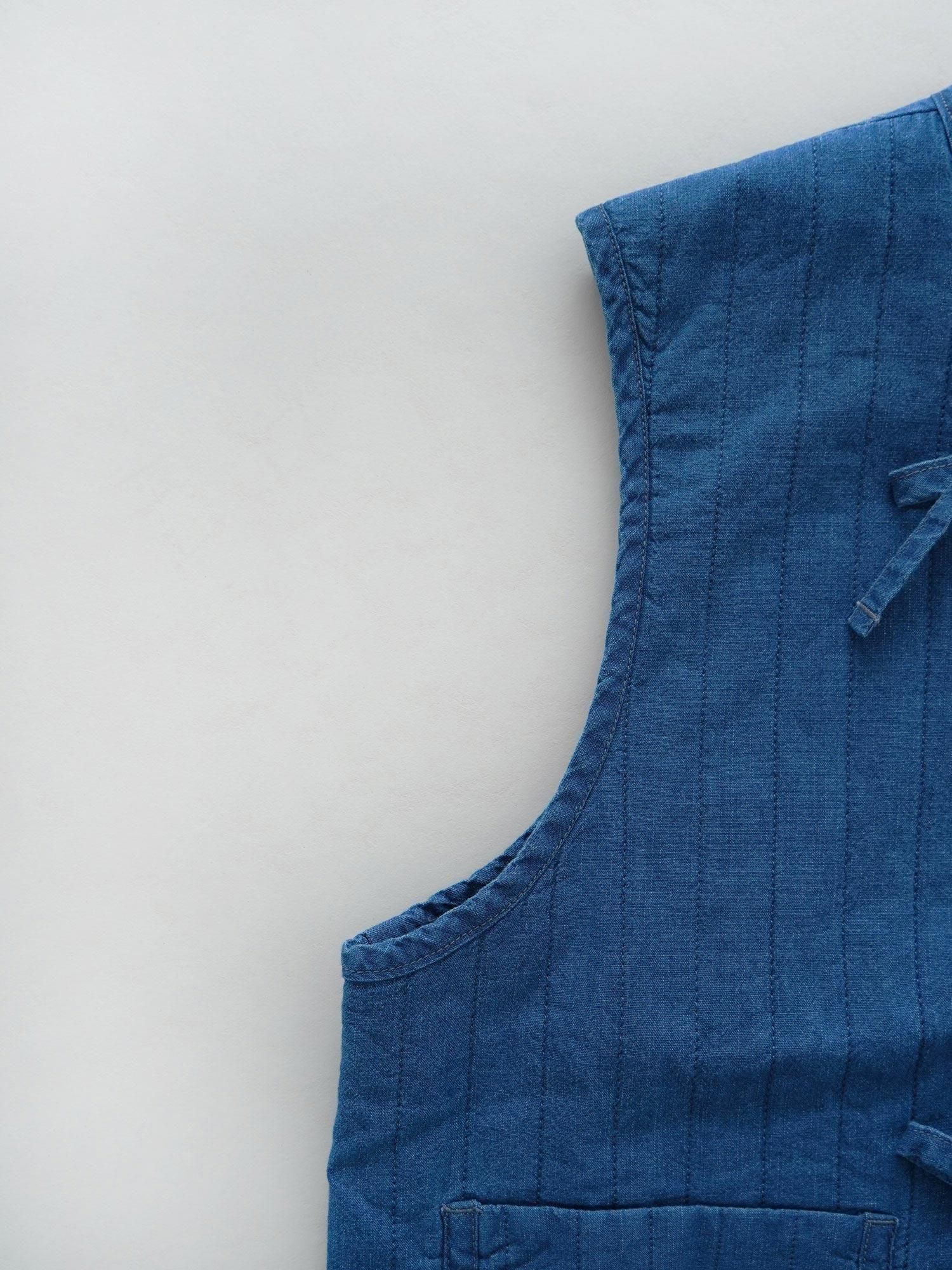 clip.tabでお馴染みのデニムのような雰囲気を持ったインディゴシャンブレー。インディゴで生地を染めた懐かしい色合い、多少の色落ちはしてしまいますが繰り返し洗いをかけていくうちに風合いの変化を重ね、自分らしい素材に育っていくところが魅力です。縦ラインのストライプのようなキルトを施し中綿を入れたベスト、コロンとした丸いシルエットであえて短めの着丈が色々なアイテムに合わせやすく、ワンピースなど長いアイテムともよく馴染みます。リボンで前を留めたり、ひもを垂らして前を開けたり、着方によって様々な表情で着こなしが楽しめる一枚です。
