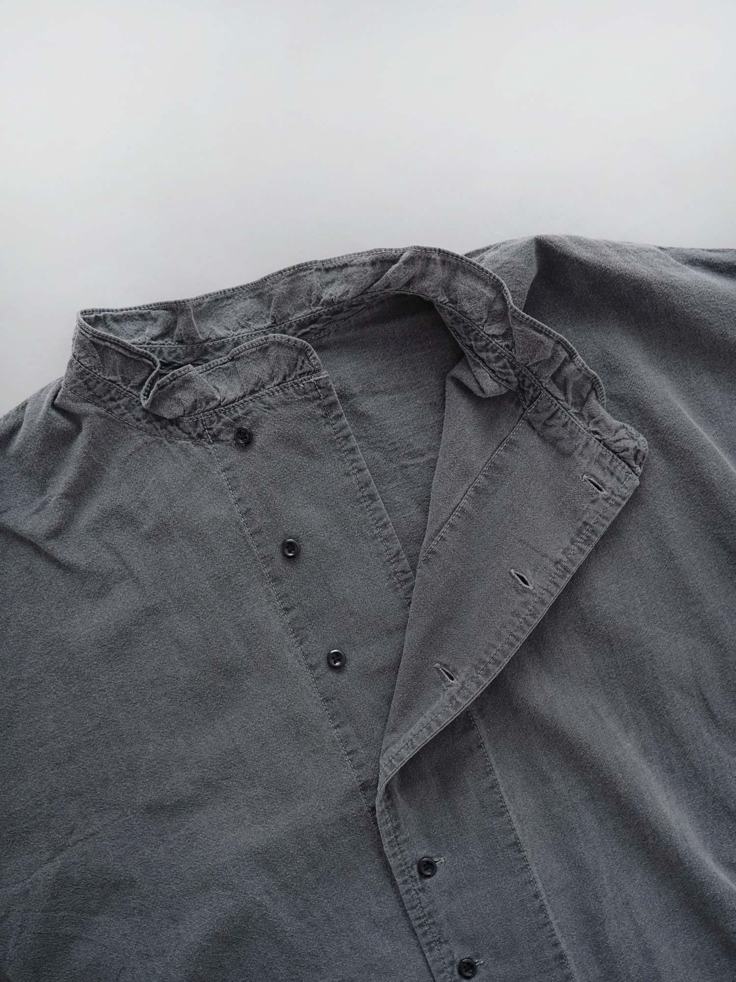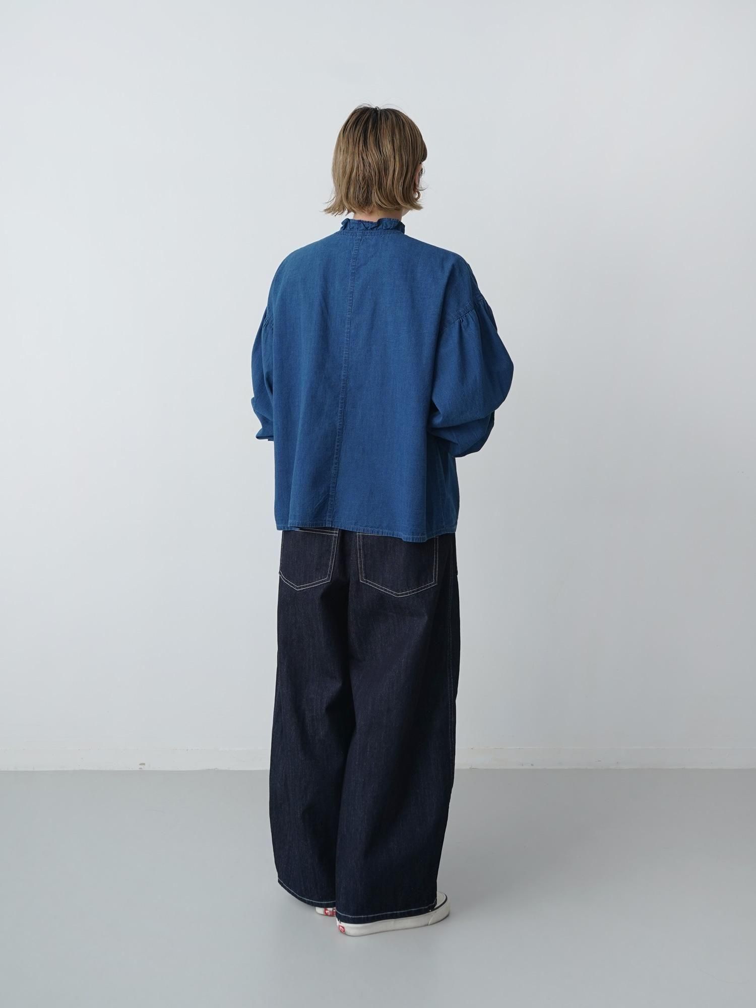 clip.tab定番素材のインディゴシャンブレー、インディゴ染めと硫化染めを施したどこか懐かしさのある色合いが特徴になっています。柔らかな質感とデニムのような風合いを持ち、繰り返し洗いをかけるほどに馴染んでいくので自分だけの愛着が湧いてくる魅力に溢れた素材。ギャザーフリルのやや立ち上がった襟と、シャーリング出来るゴムギャザーの袖がポイントのブラウス、味のあるシャンブレー生地と甘さのデザインが良い感じに合わさっています。太めの前立てと並んだ小さなボタンのバランスが目を引き、デザインポイントに。ゆったりとしたサイジングですがごわつかずインナーにタートルやTシャツを合わせたり、上にニットやジャケットを着ても素敵に着こなせます。