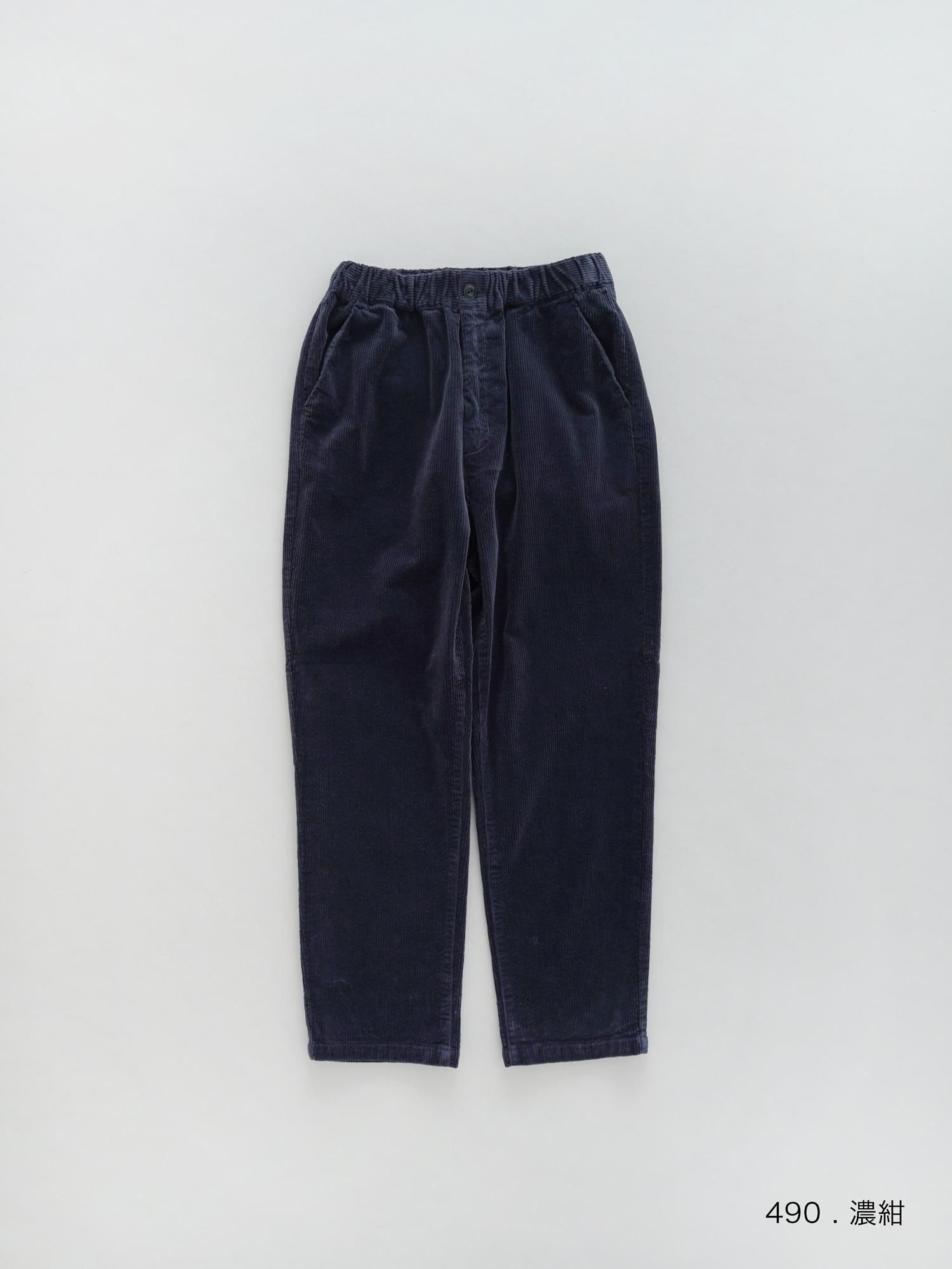 秋冬らしさのあるコーデュロイ。8ウェルと呼ばれる目の詰まったコーデュロイを製品染めとタンブラー加工で揉み込むことで、クタっとした柔らかな風合いにしています。さらにストレッチ要素を取り入れることで伸びやかなラクさが加わり、ストレスフリーな着心地になっているところも特徴に。裾に向かって緩やかに細くなったテーパードラインのパンツ、ポケットもサイドにスリットポケットが付いておりすっきりと穿け、チュニックやワンピースのインナーパンツとしても最適。ウエストが総ゴム仕様で調節が可能、リラックスして着用できるこの冬重宝するパンツに仕上がっています。